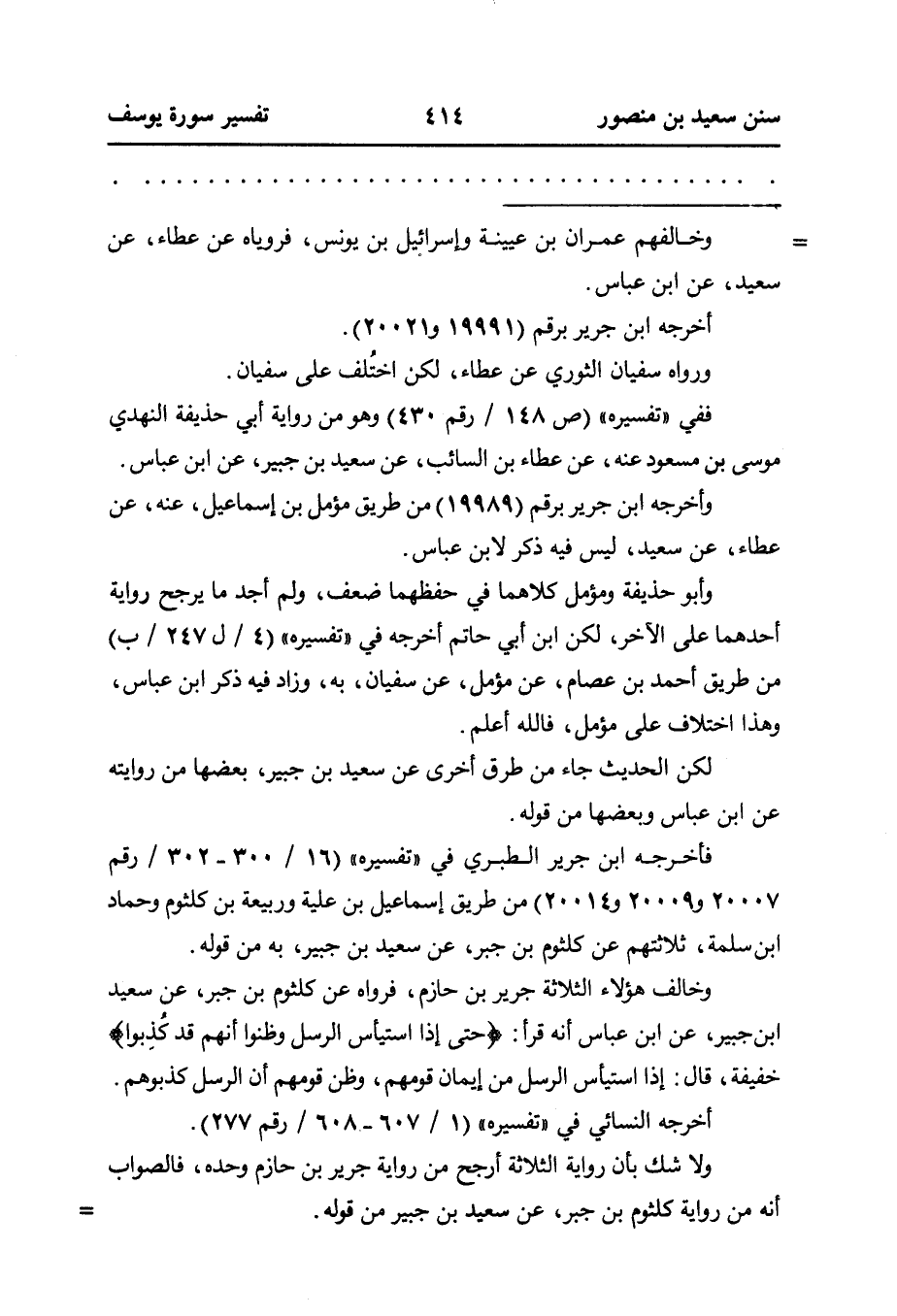 ولاشك بأن رواية الثلاثة أرجح من رواية جرير بن حازم وحده، فالصواب أنه من رواية كلثوم بن جبر، عن سعيد بن جبير من قوله. =