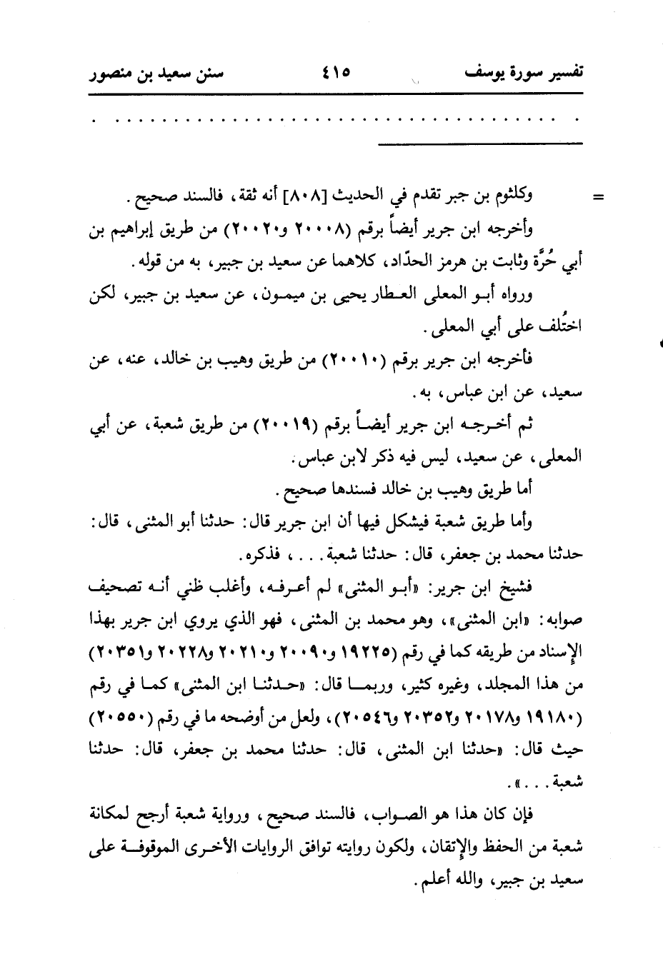 فإن كان هذا هو الصواب، فالسند صحيح، ورواية شعبة أرجح لمكانة شعبة من الحفظ والإتقان، ولكون روايته توافق الروايات الأخرى الموقوفة على سعيد بن جبير، والله أعلم.
