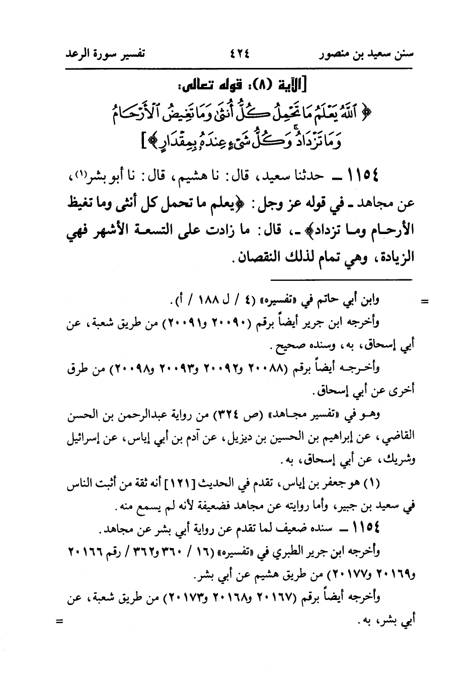 ١١٥٤ - حَدَّثَنَا سَعِيدٌ، قَالَ: نا هُشَيْمٌ، قَالَ: نا أَبُو بِشْرٍ (¬١)، عَنْ مُجَاهِدٍ - فِي قَوْلِهِ عَزَّ وَجَلَّ: {يَعْلَمُ مَا تَحْمِلُ كُلُّ أُنثَى وَمَا تَغِيضُ الأَرْحَامُ وَمَا تَزْدَادُ} -، قَالَ: مَا زَادَتْ عَلَى التِّسْعَةِ الْأَشْهُرِ فَهِيَ الزِّيَادَةُ، وَهِيَ تَمَامٌ لذلك النقصان.