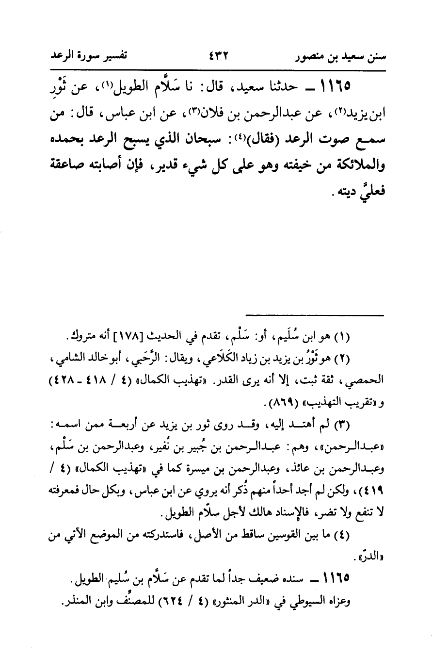 ١١٦٥ - حَدَّثَنَا سَعِيدٌ، قَالَ: نا سَلَاّم الطَّوِيلُ (¬١)، عَنْ ثَوْرِ بْنِ يَزِيدَ (¬٢)، عَنْ عَبْدِ الرَّحْمَنِ بْنِ فُلَانٍ (¬٣)، عَنِ ابْنِ عَبَّاسٍ، قَالَ: مِنَ سَمِعَ صَوْتَ الرَّعْدِ، (فَقَالَ) (¬٤): سُبْحَانَ الَّذِي يُسَبِّحُ الرَّعْدُ بِحَمْدِهِ وَالْمَلَائِكَةُ مِنْ خِيفَتِهِ وَهُوَ عَلَى كُلِّ شَيْءٍ قَدِيرٌ، فَإِنْ أَصَابَتْهُ صَاعِقَةٌ فعليَّ ديته.
