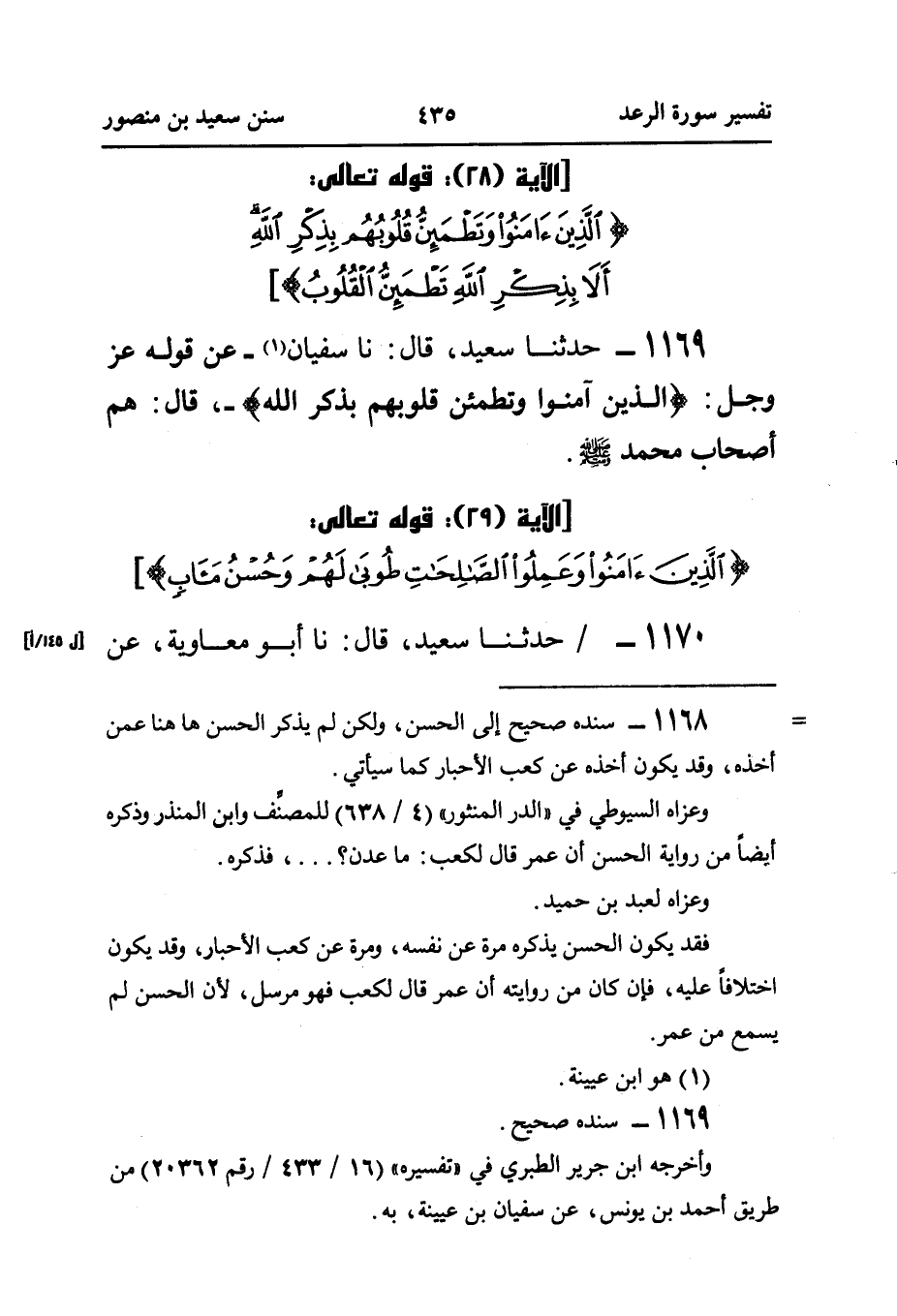 ١١٦٩ - حَدَّثَنَا سَعِيدٌ، قَالَ: نا سُفْيَانُ (¬١) - عَنْ قَوْلِهِ عَزَّ وَجَلَّ: {الَّذِينَ آمَنُوا وَتَطْمَئِنُّ قُلُوبُهُمْ بِذِكْرِ اللَّهِ} - قَالَ: هُمْ أَصْحَابُ مُحَمَّدٍ صَلَّى اللهُ عَلَيْهِ وَسَلَّمَ.