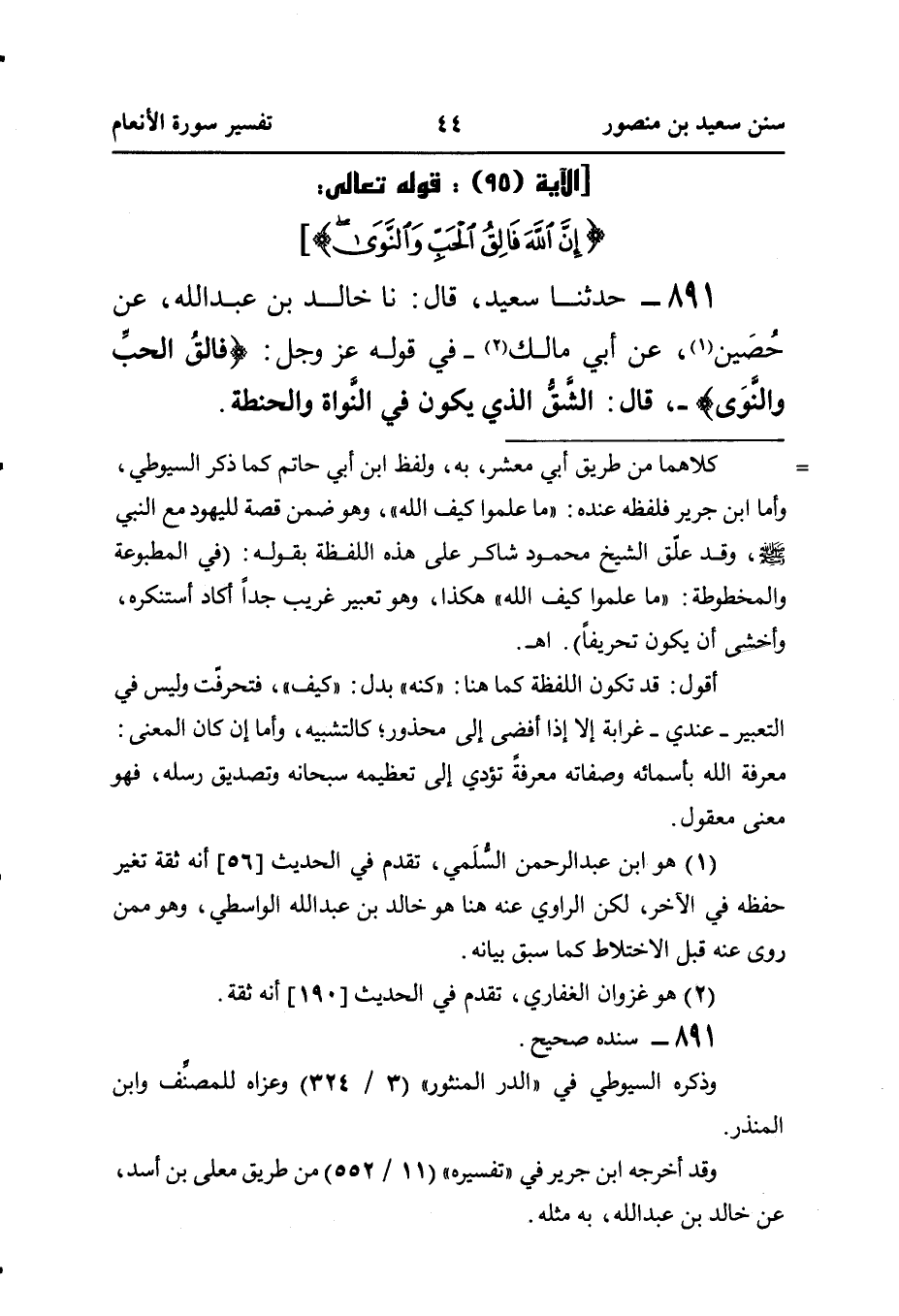 ٨٩١ - حَدَّثَنَا سَعِيدٌ، قَالَ: نا خَالِدُ بْنُ عَبْدِ اللَّهِ، عَنْ حُصَين (¬١)، عَنْ أَبِي مَالِكٍ (¬٢) - فِي قَوْلِهِ عَزَّ وَجَلَّ: {فَالِقُ الحَبِّ وَالنَّوَى} -، قَالَ: الشَّقُّ الَّذِي يَكُونُ فِي النَّواة والحنطة.
