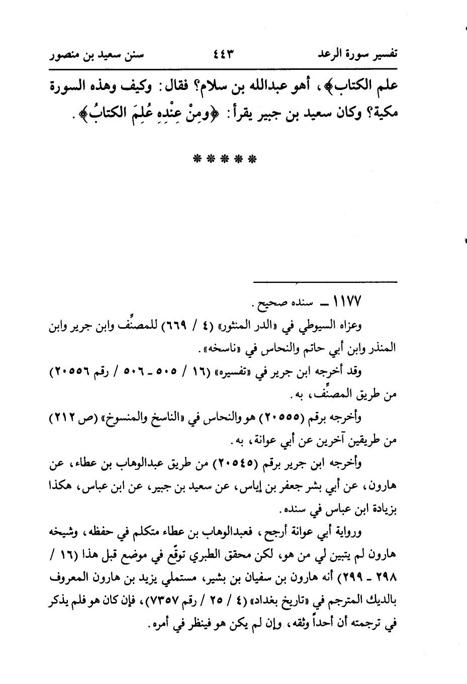 علم الكتاب}، أَهُوَ عَبْدُ اللَّهِ بْنُ سَلَّامٍ؟ فَقَالَ: وَكَيْفَ وَهَذِهِ السُّورَةُ مَكِّيَّةٌ؟ وَكَانَ سَعِيدُ بْنُ جُبَيْرٍ يَقْرَأُ: {ومِنْ عِنْدِهِ عُلِمَ الكتابُ}.