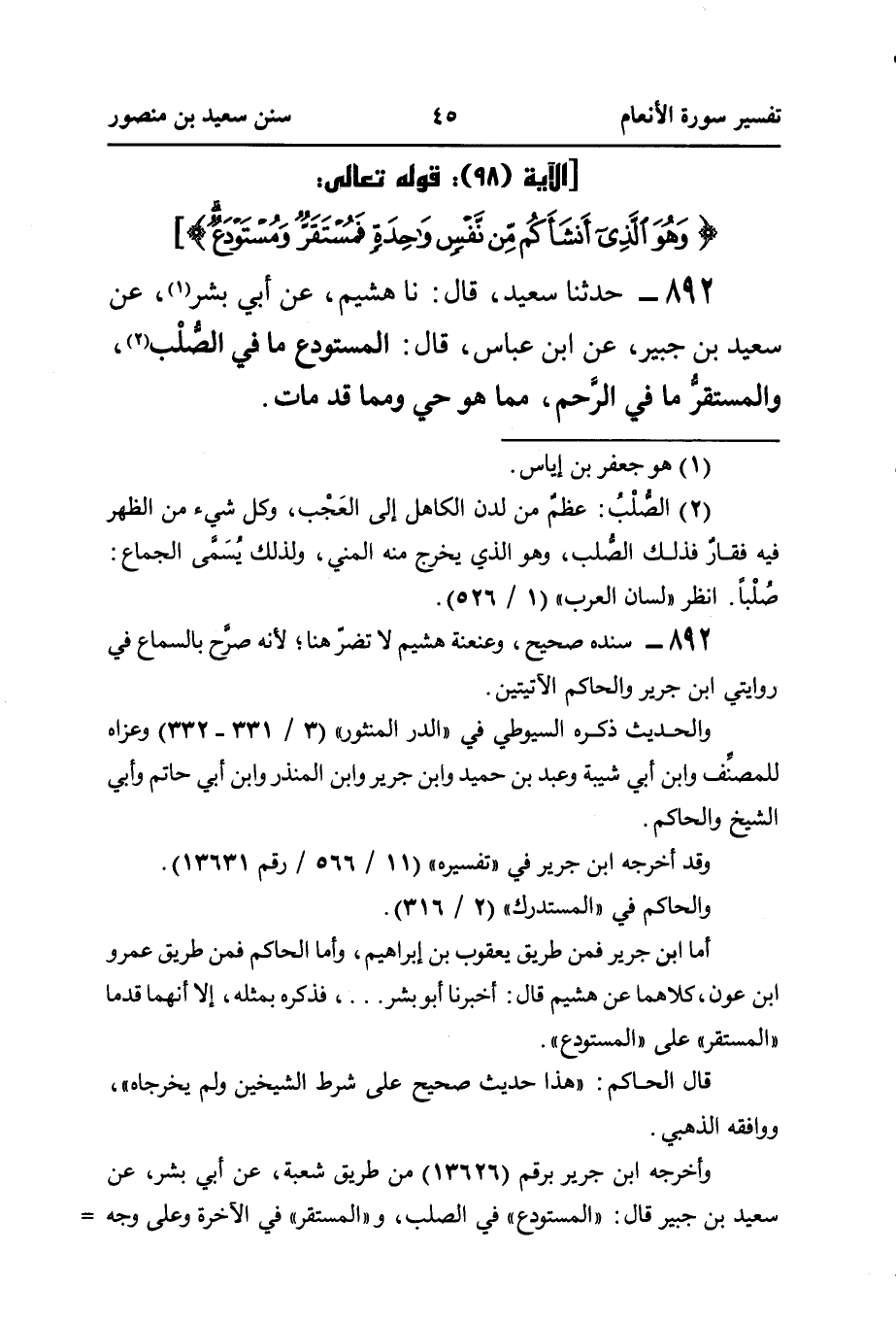 ٨٩٢ - حَدَّثَنَا سَعِيدٌ، قَالَ: نَا هُشَيْمٌ، عَنْ أَبِي بِشْرٍ (¬١)، عَنْ سَعِيدِ بْنِ جُبَيْرٍ، عَنِ ابْنِ عَبَّاسٍ، قَالَ: الْمُسْتَوْدَعُ مَا فِي الصُّلْب (¬٢)، والمستقرُّ مَا فِي الرَّحم، مِمَّا هُوَ حَيٌّ وَمِمَّا قَدْ مات.
