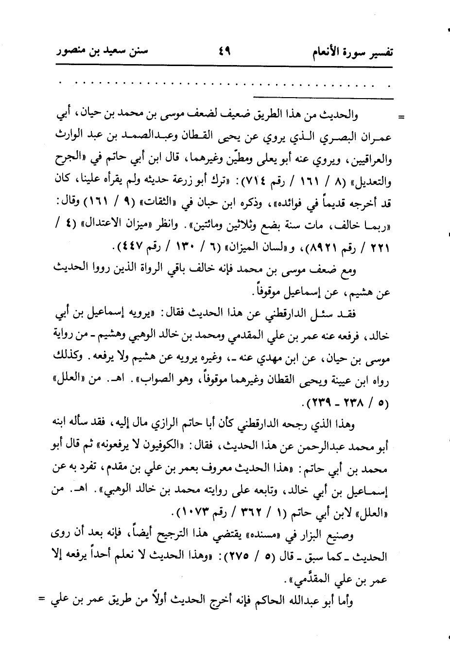 وهذا الذي رجحه الدارقطني كأن أبا حاتم الرازي مال إليه، فقد سأله ابنه أبو محمد عبد الرحمن عن هذا الحديث، فقال: (الكوفيون لا يرفعونه) ثم قال أبو محمد بن أبي حاتم: (هذا الحديث معروف بعمر بن علي بن مقدم، تفرد به عَنْ إِسْمَاعِيلَ بْنِ أَبِي خَالِدٍ، وتابعه على روايته محمد بن خالد الوهبي)) . اهـ. من "العلل" لابن أبي حاتم (١ / ٣٦٢ رقم ١٠٧٣) .