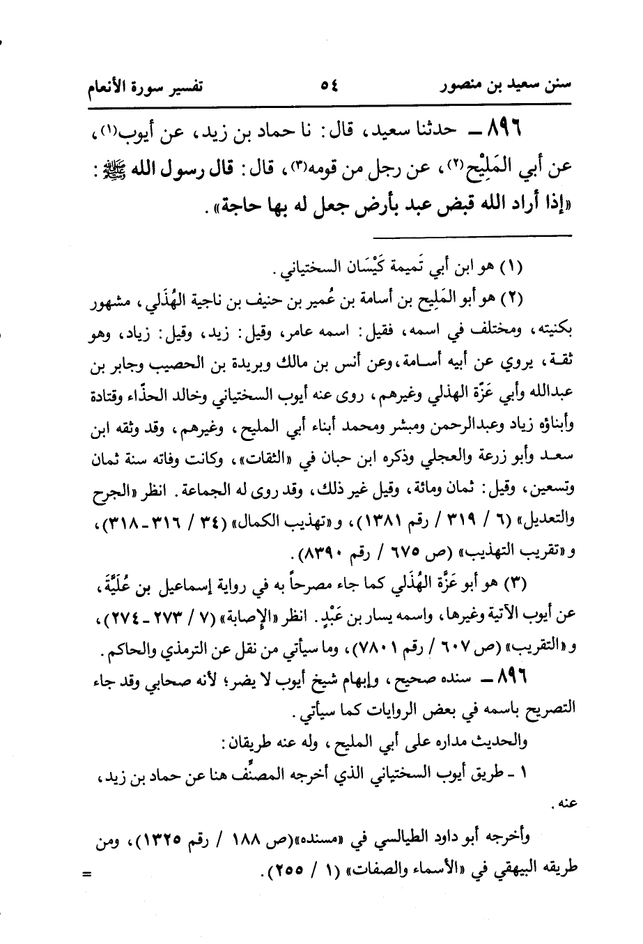 ٨٩٦ - حَدَّثَنَا سَعِيدٌ، قَالَ: نا حَمَّادُ بْنُ زَيْدٍ، عَنْ أَيُّوبَ (¬١)، عَنِ أَبِي المَلِيْح (¬٢)، عَنْ رَجُلٍ مِنْ قَوْمِهِ (¬٣)، قَالَ: قَالَ رَسُولُ اللَّهِ - صَلَّى اللهُ عَلَيْهِ وَسَلَّمَ -: ((إِذَا أَرَادَ اللَّهُ قَبْضَ عَبْدٍ بِأَرْضٍ جعل له بها حاجة)).