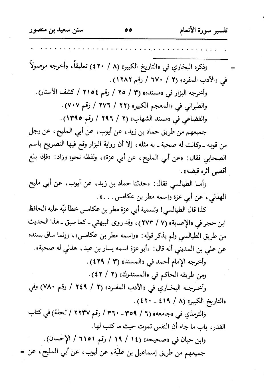 جميعهم من طريق حَمَّادُ بْنُ زَيْدٍ، عَنْ أَيُّوبَ، عَنْ أَبِي الْمَلِيحِ، عَنْ رَجُلٍ من قومه - وكانت له صحبة - به مثله، إلا أن رواية البزار وقع فيها التصريح باسم الصحابي فقال: ((عن أبي المليح، عن أبي عزة)) ، ولفظه نحوه وزاد: ((فإذا بلغ أقصى أثره قبضه)) .