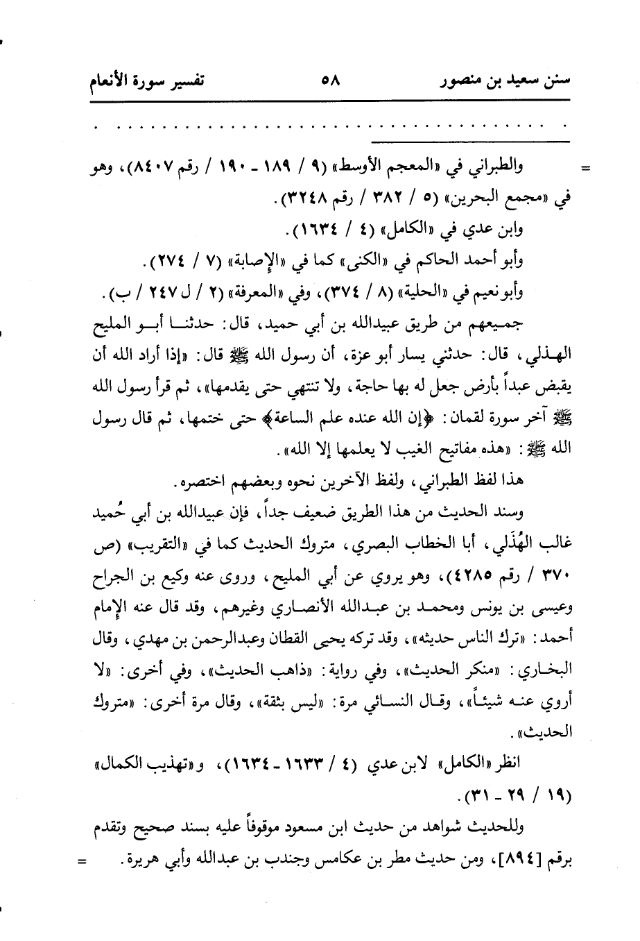 جميعهم من طريق عبيد الله بن أبي حميد، قال: حدثنا أبو المليح الهذلي، قال: حدثني يسار أبو عزة، أَنَّ رَسُولَ اللَّهِ - صَلَّى اللهُ عليه وسلم - قال: ((إذا أراد الله أن يقبض عبدًا بِأَرْضٍ جَعَلَ لَهُ بِهَا حَاجَةً، ولا تنتهي حتى يقدمها)) ، ثم قرأ رَسُولُ اللَّهِ - صَلَّى اللهُ عَلَيْهِ وسلم - آخر سورة لقمان: {إن الله عنده علم الساعة} حتى ختمها، ثم قَالَ رَسُولُ اللَّهِ - صَلَّى اللهُ عليه وسلم -: ((هذه مفاتيح الغيب لا يعلمها إلا الله)) .