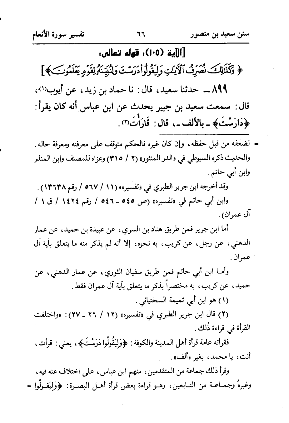 ٨٩٩ - حَدَّثَنَا سَعِيدٌ، قَالَ: نا حَمَّادُ بْنُ زَيْدٍ، عَنْ أَيُّوبَ (¬١)، قَالَ: سَمِعْتُ سَعِيدَ بْنَ جُبَيْرٍ يُحَدِّثُ عَنِ ابْنِ عَبَّاسٍ أَنَّهُ كَانَ يَقْرَأُ: {دَارَسْتَ} - بِالْأَلْفِ -، قَالَ: قارَأْتَ (¬٢).