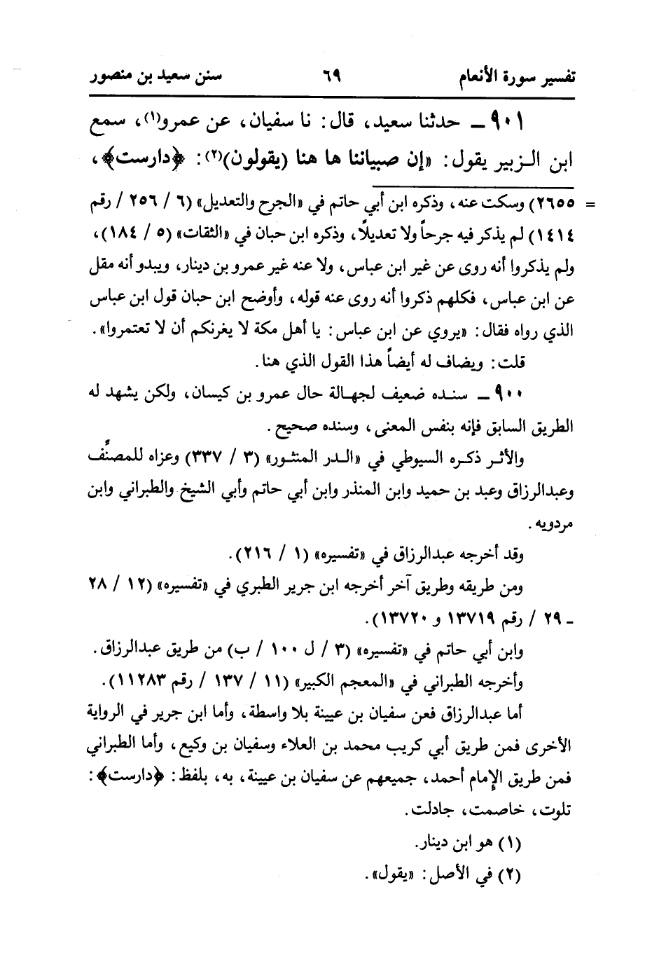 ٩٠١ - حَدَّثَنَا سَعِيدٌ، قَالَ: نا سُفْيَانُ، عَنْ عَمْرٍو (¬١)، سَمِعَ ابْنَ الزُّبَيْرِ يقول: ((إن صبياننا ها هنا (يقولون) (¬٢): {دارست}،
