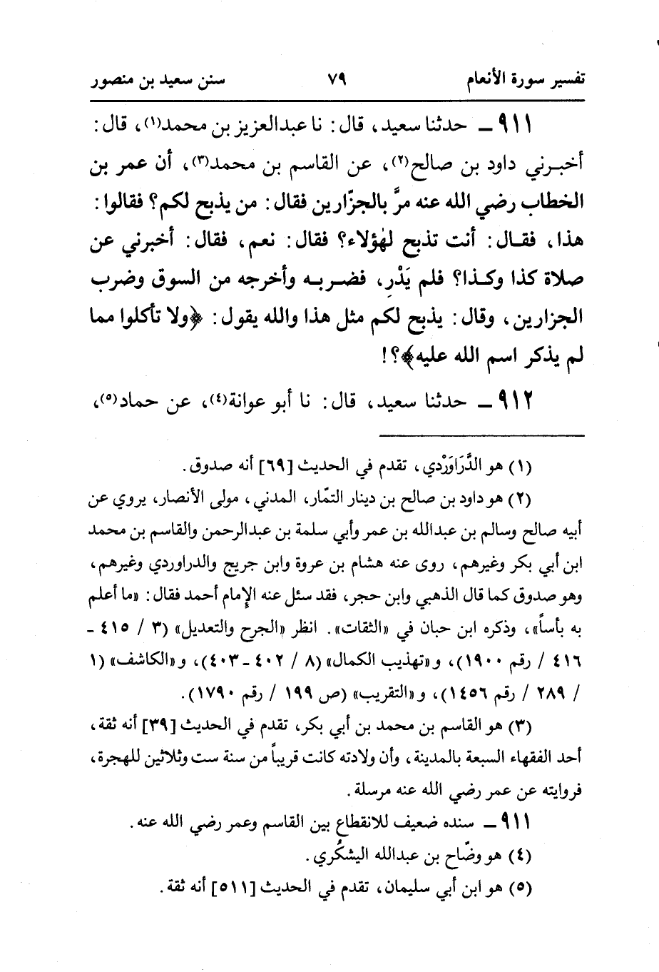 ٩١١ - حدثنا سعيد، قال: نا عبد العزيز بْنُ مُحَمَّدٍ (¬١)، قَالَ: أَخْبَرَنِي دَاوُدُ بْنُ صَالِحٍ (¬٢)، عَنِ الْقَاسِمِ بْنِ مُحَمَّدٍ (¬٣)، أَنَّ عُمَرَ بْنَ الْخَطَّابِ رَضِيَ اللَّهُ عَنْهُ مرَّ بِالْجَزَّارِينَ فَقَالَ: مَنْ يَذْبَحُ لَكُمْ؟ فَقَالُوا: هَذَا، فَقَالَ: أَنْتَ تَذْبَحُ لِهَؤُلَاءِ؟ فَقَالَ: نَعَمْ، فَقَالَ: أَخْبِرْنِي عَنْ صَلَاةِ كَذَا وَكَذَا؟ فَلَمْ يَدْرِ، فَضَرَبَهُ وَأَخْرَجَهُ مِنَ السُّوقِ وَضَرَبَ الْجَزَّارِينَ، وَقَالَ يَذْبَحُ لَكُمْ مِثْلُ هَذَا وَاللَّهُ يَقُولُ: {وَلَا تَأْكُلُوا مِمَّا لَمْ يُذْكَرِ اسْمُ اللهِ عَلَيْهِ}؟!