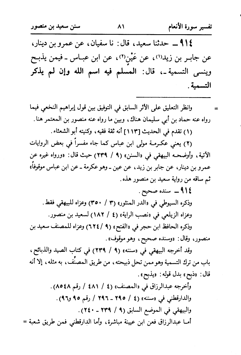 ٩١٤ - حَدَّثَنَا سَعِيدٌ، قَالَ: نا سُفْيَانُ، عَنْ عَمْرِو بْنِ دِينَارٍ، عَنْ جَابِرِ بْنِ زَيْدٍ (¬١)، عَنْ عَيْنٍ (¬٢)، عَنِ ابْنِ عَبَّاسٍ - فِيمَنْ يَذْبَحُ وَيَنْسَى التَّسْمِيَةَ -، قَالَ: الْمُسْلِمُ فِيهِ اسْمُ اللَّهِ وَإِنْ لَمْ يَذْكُرِ التسمية.