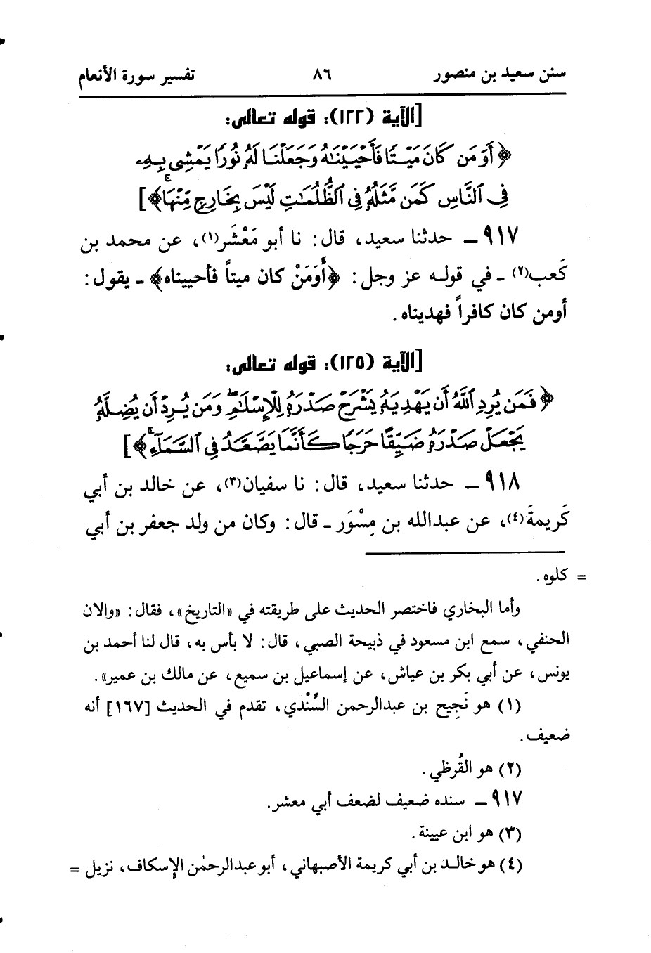 ٩١٧ - حَدَّثَنَا سَعِيدٌ، قَالَ: نَا أَبُو مَعْشَر (¬١)، عَنْ مُحَمَّدِ بْنِ كَعب (¬٢) - فِي قَوْلِهِ عَزَّ وَجَلَّ: {أَوَمَنْ كَانَ مَيْتًا فَأَحْيَيْنَاهُ} - يقول: أو من كَانَ كَافِرًا فَهَدَيْنَاهُ.