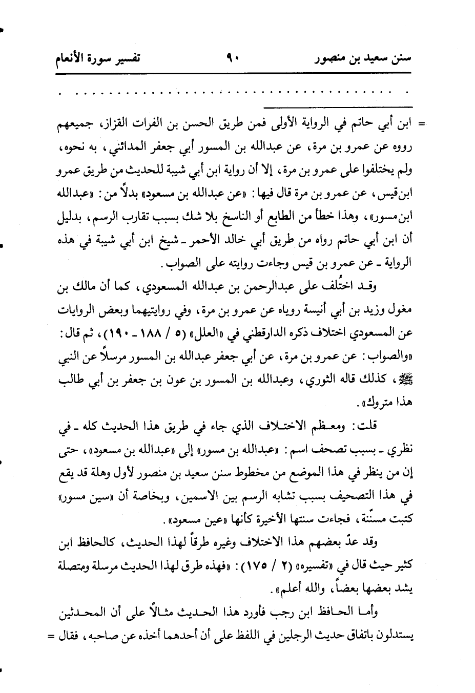 قلت: ومعظم الاختلاف الذي جاء في طريق هذا الحديث كله - في نظري - بسبب تصحف اسم: ((عبد الله بن مسور)) إلى ((عبد الله بن مسعود)) ، حتى إن من ينظر في هذا الموضع من مخطوط سنن سعيد بن منصور لأول وهلة قد يقع في هذا التصحيف بسبب تشابه الرسم بين الاسمين، وبخاصة أن ((سين مسور)) كتبت مسنّنة، فجاءت سنتها الأخيرة كأنها ((عين مسعود)) .