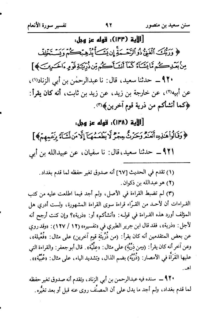 ٩٢٠ - حَدَّثَنَا سَعِيدٌ، قَالَ: نَا عَبْدُ الرَّحْمَنِ بْنُ أَبِي الزِّنَادِ (¬١)، عَنْ أَبِيهِ (¬٢)، عَنْ خَارِجَةَ بْنِ زَيْدٍ، عَنْ زَيْدِ بْنِ ثَابِتٍ، أَنَّهُ كَانَ يَقْرَأُ: {كَمَا أَنْشَأَكُمْ مِنْ ذُرِّيَّةِ قَوْمٍ آخَرِينَ} (¬٣).