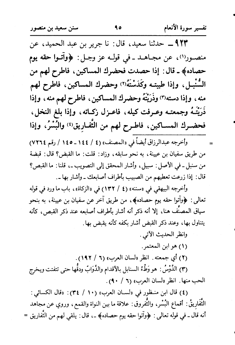 ٩٢٣ - حَدَّثَنَا سَعِيدٌ، قَالَ: نا جَرِيرٌ بن عبد الحميد، عَنْ مَنْصُورٍ (¬١)، عَنْ مُجَاهِدٍ - فِي قَوْلِهِ عَزَّ وَجَلَّ: {وَآتُوا حَقَّهُ يَوْمَ حَصَادِهِ} - قَالَ: إِذَا حَصَدْتَ فَحَضَرَكَ الْمَسَاكِينُ، فَاطْرَحْ لَهُمْ مِنَ السُّنْبل، وَإِذَا طَيَّبْتَهُ وَكَدَسْتَهُ (¬٢) وَحَضَرَكَ الْمَسَاكِينُ، فَاطْرَحْ لَهُمْ مِنْهُ وَإِذَا دُسْتَهُ (¬٣) وذَرَيْتَهُ وَحَضَرَكَ الْمَسَاكِينُ، فَاطْرَحْ لَهُمْ مِنْهُ، وَإِذَا ذَرَيْتَهُ وَجَمَعْتَهُ وَعَرَفْتَ كَيْلَهُ، فَاعْزِلْ زَكَاتَهُ، وَإِذَا بَلَغَ النَّخْلُ، فَحَضَرَكَ الْمَسَاكِينُ فَاطْرَحْ لَهُمْ مِنَ الثَّفارِيق (¬٤) والبُسْرُ، وإذا