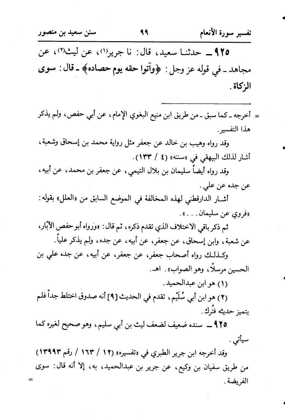٩٢٥ - حَدَّثَنَا سَعِيدٌ؛ قَالَ: نا جَرِيرٌ (¬١)، عَنْ لَيْثٍ (¬٢)، عَنْ مُجَاهِدٍ - فِي قَوْلِهِ عَزَّ وَجَلَّ: {وَآتُوا حَقَّهُ يَوْمَ حَصَادِهِ} - قال: سوى الزكاة.