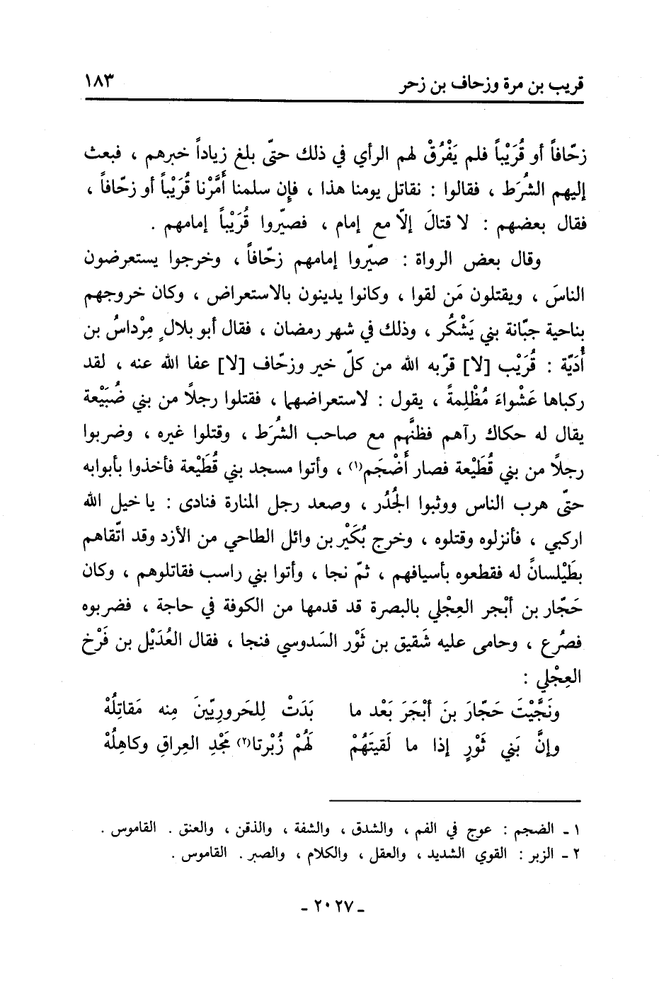 (1) الطبري 2: 187 وعيون الأخبار 1: 163 والكامل 3: 253 وياقوت 1: 62 واليعقوبي 2: 279 وديوان المعاني 2: 230 والدينوري: 269 وشعر الخوارج: 54 و 1، 2 أيضا في ابن الأثير 3: 430 والبكري: 123 وشطر الأول وعجز الثاني والثالث في العقد 1: 149 والأول في ياقوت 1: 61، 2: 454 ومعرب الجواليقي: 21