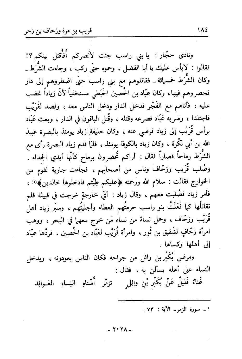 فقتل، قتله كهمس بْن طلق التميمي. وقال أَبُو بلال «3» : انكم فِي يوم عظيم، وهذا آخر أوقات العصر، فوادعونا حتى نصلي، فأجابهم ابن أخضر وتحاجزوا، فعجل عباد وأصحابه الصلاة- ويقال قطعها والقوم يصلون صلاتهم- ثم شد عباد وأصحابه فقتلوهم وهم بين قائم وراكع وساجد، لم ينثن «4» أحد منهم عَنْ حاله التي كان عليها حتّى أتوا عليهم، وأخذ رأس أبي بلال: بشر بْن حجل أحد بني تيم اللات وجاء به، وقتل مع أبي بلال حبيبة «5» بْن همام النكري من عبد القيس، فَقَالَ عمران بْن حطان السدوسي فِي قصيدة له أولها «6» :