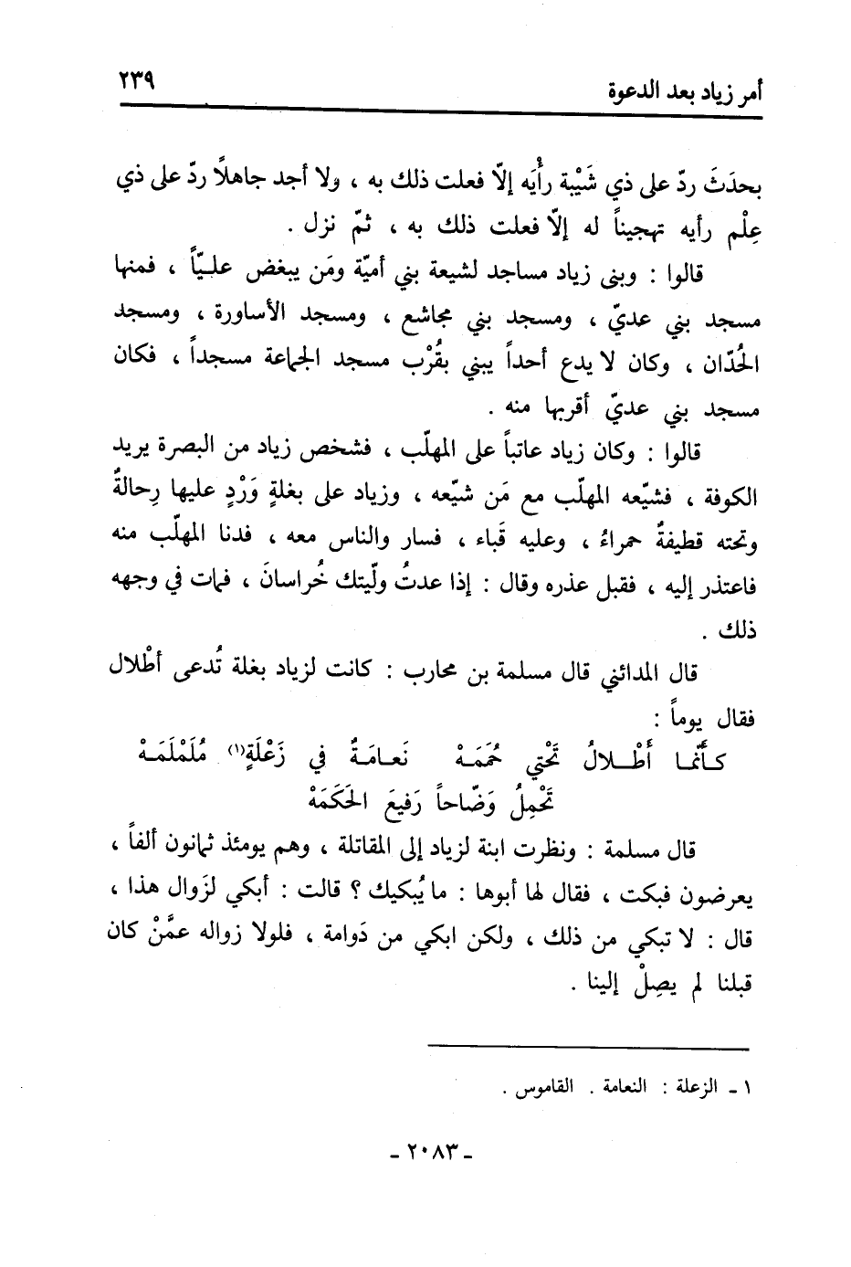 631- حَدَّثَنِي عُمَرُ «2» بْنُ بُكَيْرٍ عَنِ الْهَيْثَمِ بْنِ عَدِيٍّ عَنْ ابن عياش عن عجلان حاجب زياد ومولاه قَالَ: دخل زياد يومًا من صلاة الظهر فإذا هرة فِي زاوية المجلس، فأردت طردها فنهاني، فلم تزل كذلك حتى صلى العصر، ثم عاد فجعل يلاحظها، فلما كادت الشمس تغرب خرج جرذ فوثبت عليه فأخذته، فَقَالَ: من طلب حاجة فليصبر صبر هذه الهرة فإنه يظفر بحاجته.