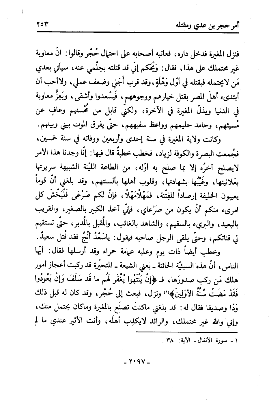 وكان رجل من بني أسد قتل رجلًا، كان من أهل الذمة فأسلم، فَقَالَ زياد: لا أقتل عربيًا بنبطي، وأمر القاتل أن يعطي أولياء المقتول الدية فلم يقبلوها، وقالوا: كنا نخبر أن دماء المسلمين تتكافأ، وأن لا فضل لعربي على غيره، فقام حجر وأصحابه، فَقَالَ حجر: يَقُول اللَّه عز وجل (النَّفْسَ بِالنَّفْسِ وتقول أنت غير ذلك، واللَّه لتقيدنه أو لأضربنّك (804) بسيفي، فما برح حتّى قتل الأسدي، فلذلك كتب إلى مُعَاوِيَة فِي أمره «1» .