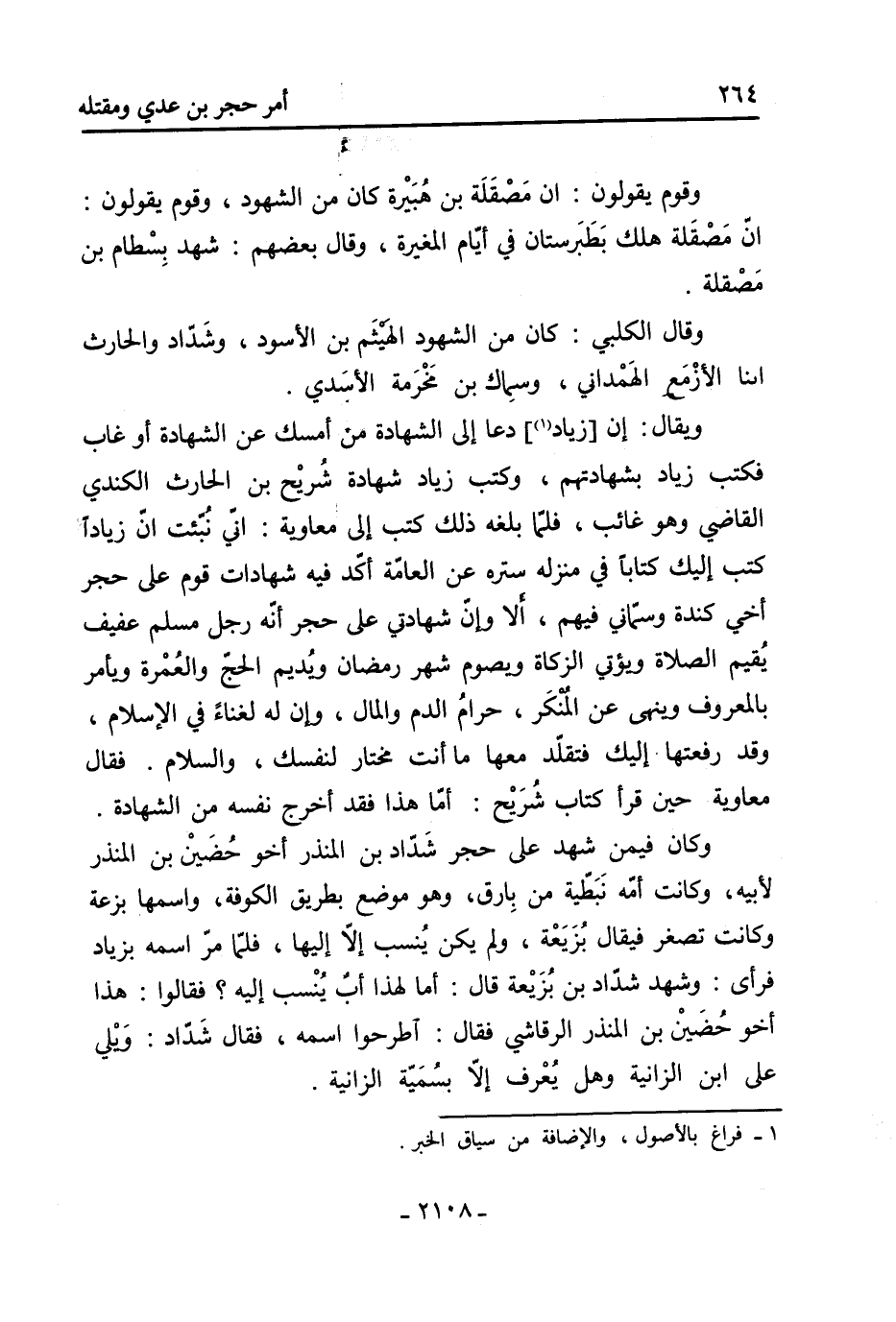 693- قَالُوا: وَبَعَثَ مُعَاوِيَةُ رَجُلا وَقَالَ لَهُ: امْضِ حَتَّى تَجْلِسَ إِلَى الْحُسَيْنِ وَتَنْعِيَ حَجَرًا، وَانْظُرْ مَا يَقُولُ، فَقَالَ لَهُ الرَّجُلُ: إِنَّ مُعَاوِيَةَ قَتَلَ حَجَرًا (وَأَصْحَابَهُ) قَالَ: ثُمَّ صَنَعَ مَاذَا؟ قَالَ: كَفَّنَهُمْ وَدَفَنَهُمْ، فَقَالَ: خَصَّمُوهُ وَرَبِّ الْكَعْبَةِ، ثُمَّ تَرَحَّمَ عَلَى حَجَرٍ.