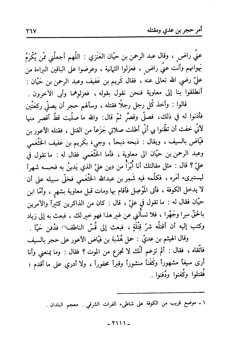 708- وحدثت عَنْ عثمان بْن مقسم البري عن الحسن، وكان مع الربيع بن زياد بناحية خراسان، قَالَ، قَالَ الربيع لما بلغه قتل حجر وأصحابه: ألا إن الفتنة قد كانت تكون ولم يكن قتل الصبر، وقد قتل حجر وأصحابه صبرًا، فهل من ثائر، هل من معين، هل من منكر؟! قَالَ ذلك مرارًا، فلم يجبه أحد، فَقَالَ: أما إذ أبيتم فستبتلون بالقتل صبرًا على الظلم.