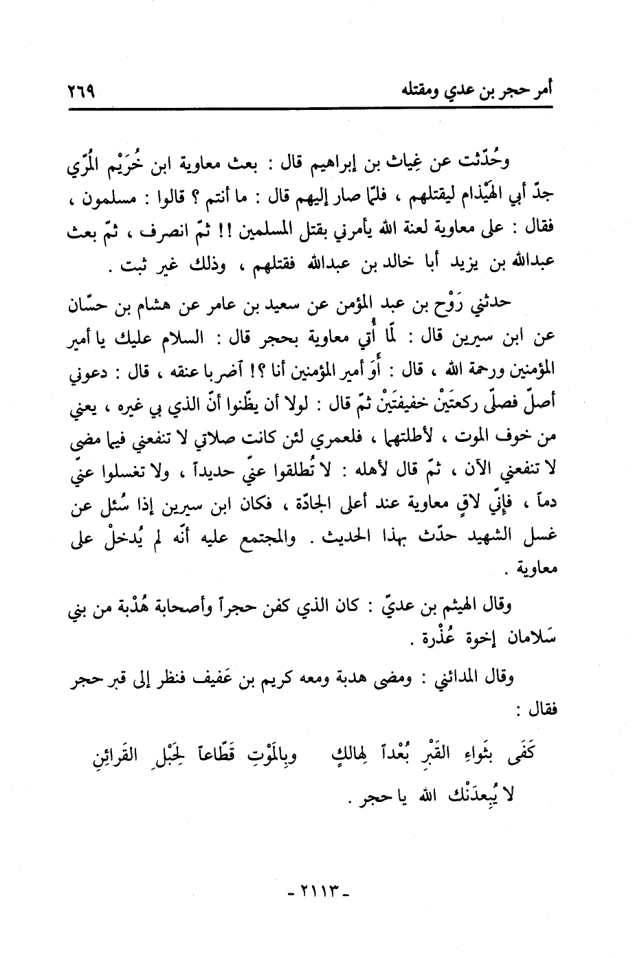 715- قالوا: وعوتب الْهَيْثَم بْن الأسود النخعي على شهادته على حجر، وكان ممن عاتبه عمير أَبُو العمرطة ورجل يقال له عمرو بْن أبي فروة، فَقَالَ: