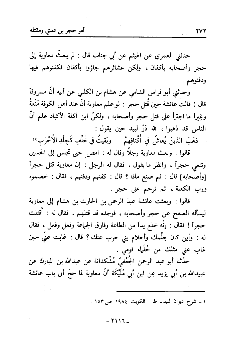 أقاتل عنك، فَقَالَ: انج بنفسك، وسألوا عمرًا من هو فلم يخبرهم، فبعث به عبد الله ابن أبي تلعة إلى عبد الرحمن بْن أم الحكم أخت مُعَاوِيَة، وهو الذي قتل علي جده عثمان الثقفي «5» يوم حنين، وكان عبد الرحمن على الموصل والجزيرة «6» - ويقال على الموصل وأعمالها ومعها شهرزور- فلما رأى عمرو بْن الحق عرفه فحبسه، وكتب إلى خاله مُعَاوِيَة بظفره به، فكتب مُعَاوِيَة إليه: إنه يزعم أنه طعن عثمان تسع طعنات، وإنا لا نريد أن نعتدي عليه، فاطعنه تسع طعنات كما طعن عثمان، فأخرج فطعن تسعًا مات فِي الأولى منهن أو الثانية، ثم احتز رأسه وبعث به إلى مُعَاوِيَة، فهو أول رأس بعث به إلى