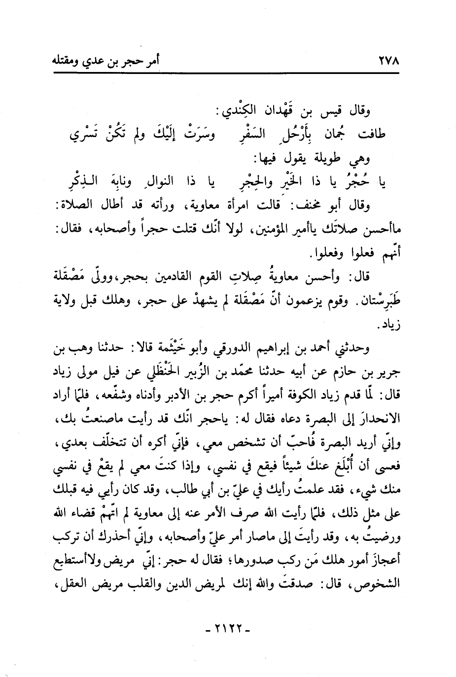 744- وقال (815) عبد اللَّه بْن خالد لشريح وسليم: بماذا تأمرانني؟ قالا له: أنت الأمير فانزل القصر، فنزله، وقال مُعَاوِيَة حين بلغه خبره: لا واللَّه ولا على عجم أحد المصرين، فتركه سنة ثم بعث إليه: إن شئت حاسبناك وأعطيناك ألف ألف درهم، وإن شئت فلا محاسبة ولا جائزة، فدعا خالدًا وأمية ابنيه فَقَالَ: ما تريان؟ قالا: قد أخذنا لك عشرين ألف ألف فلا ترد محاسبة ولا جائزة، فعزله وولى الضحاك بْن قيس الكندي الكوفة «2» .