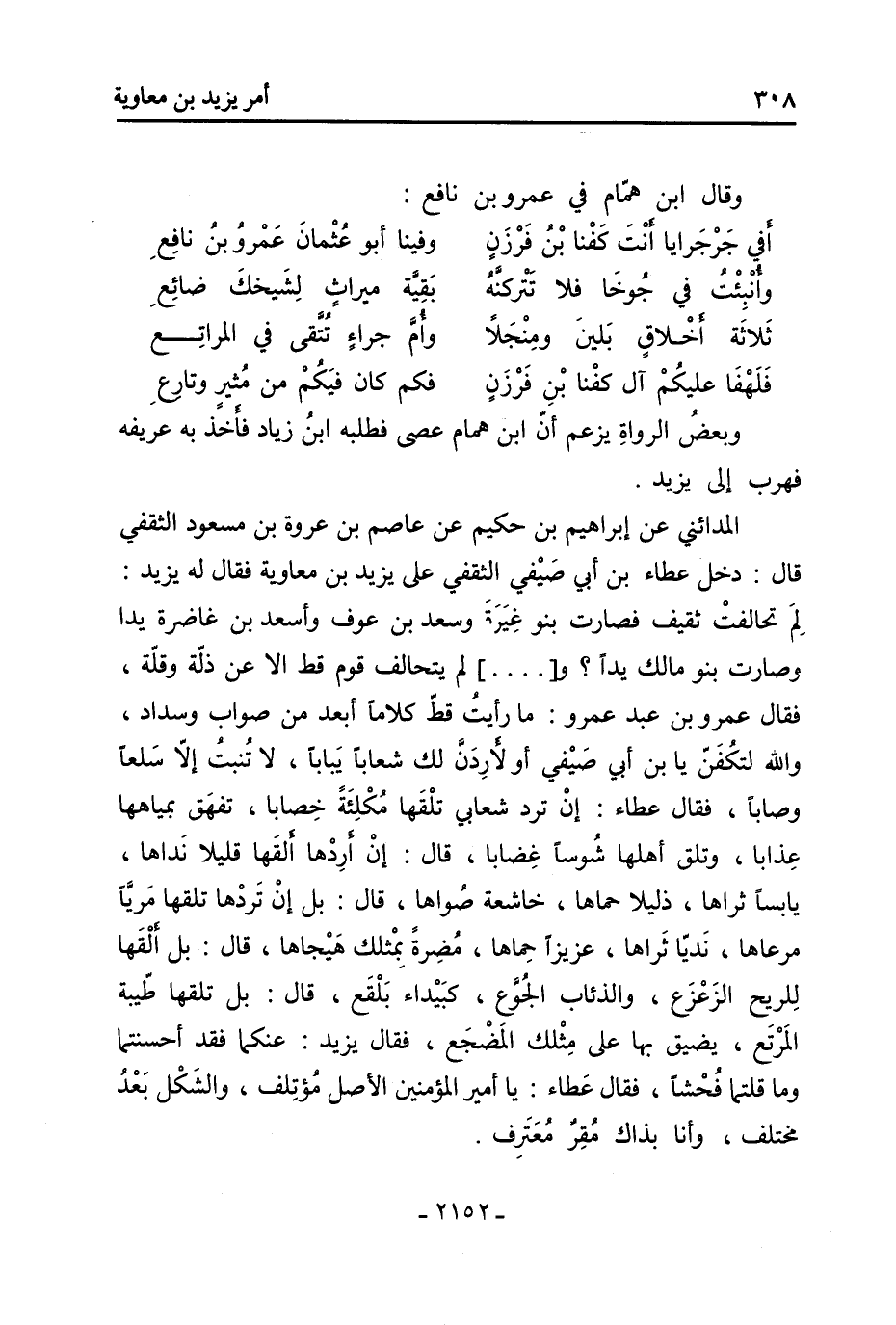 فَقَالَ له «1» عبد اللَّه بْن جعفر وَمُعَاوِيَة بْن يزيد: يا أمير المؤمنين إن ابْن الزُّبَيْرِ رجل أبي لجوج فدعه على أمره ولا «2» تهجه لما لا تحتاج إليه، فأوفد إليه «3» الحصين بْن نمير السكوني ومسلم بْن عقبة المري وزفر بْن الحارث الكلابي وعبد اللَّه بْن عضاه الأشعري وروح بْن زنباع الجذامي ومالك بْن هبيرة السكوني ومالك بْن حمزة «4» الهمداني وأبا «5» كبشة السكسكي وزمل بْن عمرو العذري وعبد الله بن مسعدة الفزاري وناتل بْن قيس الجذامي والضحاك بْن قيس، وأمرهم أن يعلموه أنه إنما بعث بهم احتجاجًا عليه وإعذارًا إليه، وأن يحذروه الفتنة ويعرفوه ما له عنده من البر والتكرمة إذا أبر يمينه وأتاه فِي الجامعة التي بعث بها إليه معهم، وكان قد دفع اليهم جامعة من فضّة، فقال له ابن عضاه: يا أبا بكر قد كان من أثرك في أمر الخليفة المظلوم ونصرتك إياه يوم الدار ما لا يجهل، وقد غضب أمير المؤمنين بما كان من إبائك مما «6» قدم عليك فيه النعمان وهمام، وحلف أن تأتيه فِي جامعة خفيفة لتحل يمينه، فالبس عليها برنسًا فلا ترى، ثم أنت الأثير عند أمير المؤمنين الذي لا يخالف «7» فِي ولاية ولا مال، وقال له القوم مثل ذلك، فَقَالَ: واللَّه ما أنا بحامل نفسي على الذلة ولا راض بالخسف، وما يحل لي أن أفعل ما تدعوني إليه، فليجعل يزيد يمينه هذه فِي أيمان قد حنث فيها، وقال أيوب بْن زهير بْن أبي أُمَيَّة المخزومي: ليست يمين يزيد فِي ابْن الزُّبَيْرِ بأول يمين حنث فيها ووجب عليه تكفيرها ولا آخرها، ثم بسط ابْن الزُّبَيْرِ لسانه فِي يزيد بْن مُعَاوِيَة وتنقصه وقال: لقد بلغني أنه يصبح سكران ويمسي كذلك، ثم تمثل قول الشاعر «8» :
