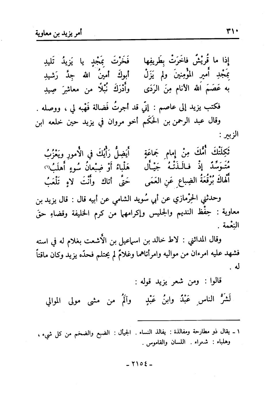 يزيد بموت مُعَاوِيَة جزع جزعًا شديدًا وجعل يقوم ويرمي بنفسه على فراشه ثم بعث إلى مروان فجاءه وعليه قميص أبيض وملاءة موردة لبيسة، فنعى إليه مُعَاوِيَة وأعلمه أن يزيد بعث إليه بأخذ «1» البيعة على هؤلاء الرهط، فترحم مروان على مُعَاوِيَة ثم قَالَ: ابعث إلى النفر الساعة فأدعهم إلى البيعة، فإن بايعوا وإلا فاضرب أعناقهم، فَقَالَ الوليد: يا سبحان اللَّه أقتل الحسين وعبد اللَّه بْن الزبير، قَالَ: هو ما قلت لك، فبعث «2» إلى الحسين وابْن الزُّبَيْرِ وابن عُمَر وابن مطيع، فجاء الحسين أولهم وعليه قميص قوهي وإزار مصبوغ بزعفران، وهو مطلق إزاره، فسلم ثم جلس، ثم جاء عبد اللَّه بْن الزبير فِي ثوبين غليظين مشمرًا إلى نصف ساقه فسلم وجلس، ثم جاء عبد اللَّه بْن مطيع فإذا رجل «3» ثائر الشعر أحمر العينين فسلم ثم جلس، فحمد الوليد اللَّه وأثنى عليه، ثم نعى مُعَاوِيَة ودعاهم إلى بيعة يزيد، فبدر ابْن الزُّبَيْرِ بالكلام وكأنه خاف أن يهنوا، ثم ترحم على مُعَاوِيَة ودعا له، ثم ذكر الوليد فجزاه خيرًا فَقَالَ: وليتنا فأحسنت «4» ولايتنا ووصلت أرحامنا، وقد علمت الذي كان منا فِي بيعة يزيد، وأنه قد احتمل ذلك علينا، ومتى بايعنا والباب مغلق علينا تخوفنا أن لا يذهب ذلك ما فِي قلبه، فإن رأيت أن تصل أرحامنا وتحسن فيما بيننا وبينك فتخلي سبيلنا ثم تأمر فينادى «5» الصلاة جامعة وتصعد المنبر فنأتي فنبايع على رؤوس الناس طائعين غير مكرهين، قَالَ: وجعل مروان كلما نظر إلى الوليد أشار إليه أن اضرب «6» أعناقهم، قَالَ: فخلى الوليد عنهم، فخرجوا فَقَالَ مروان: واللَّه لا يصبح (832) وبها منهم أحد، فلما أتى كل واحد منهم منزله دعا براحلته ثم رمى بها الطريق إلى مَكَّة وأصبح الوليد فلم يجد منهم أحدًا.