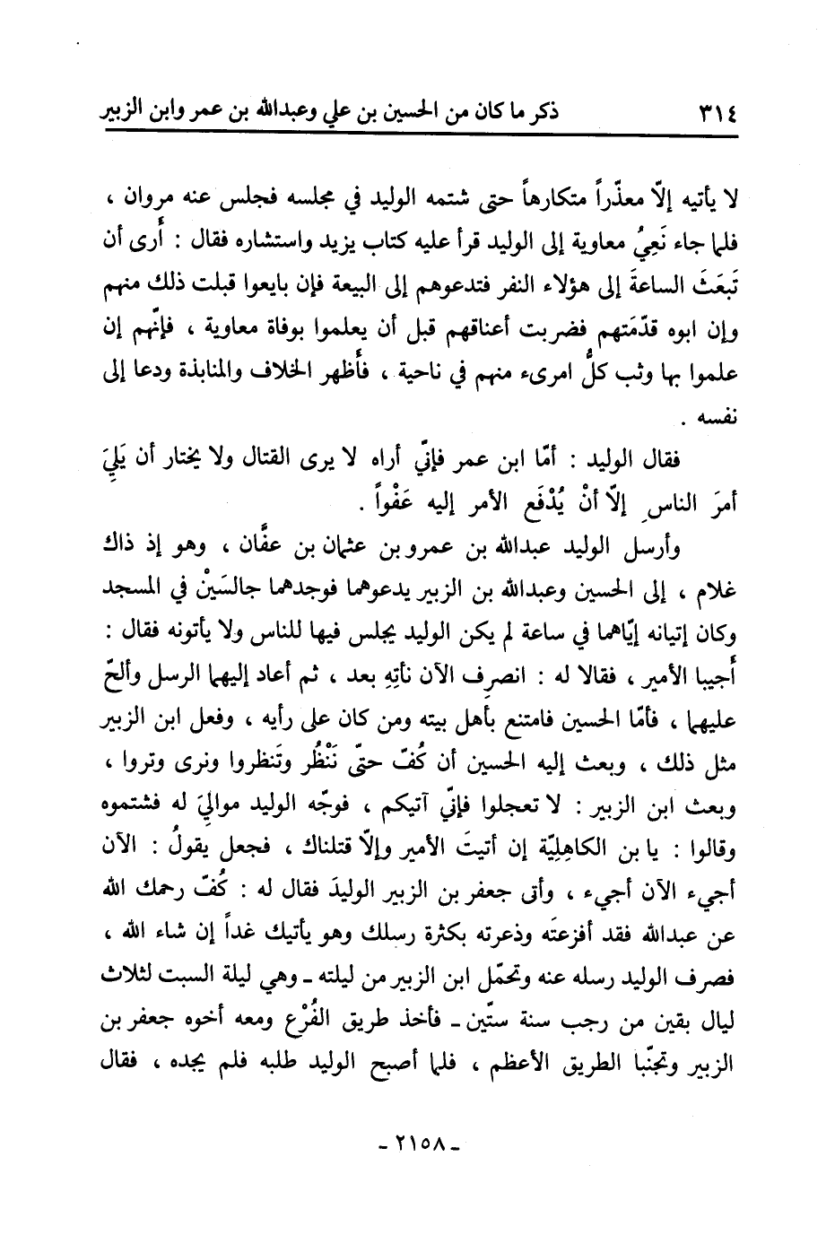 (834) فوبخه فَقَالَ: أي عدو اللَّه استخففت بحرم اللَّه، وأمر به إلى الحبس، فَقَالَ عبيدة بْن الزبير: إني قد أجرته، فَقَالَ عبد الله: إنّ للناس عليه حقوقا ولا بدّ من أن أقصهم، فضربه عبد اللَّه بكل سوط ضربه أحدًا بالمدينة سوطًا وأقص منه كلّ من لطمه وتناوله حتى سبط ميتًا، وقيل ان عمرو بْن الزبير لم يزل محبوسًا حتى بويع ابْن الزُّبَيْرِ وأقاد منه حتى مات، وإن فل عمرو قدموا المدينة فضربهم الأشدق فلامه يزيد على ذلك.