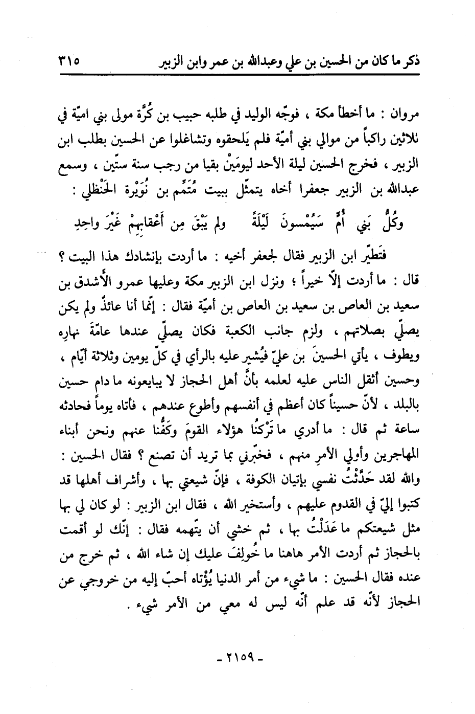 818- وكان ابْن الزُّبَيْرِ يخطب فيقول: واللَّه لا أريد إلا الإصلاح وإقامة الحق، ولا ألتمس جمع مال ولا ادخاره، وإنما بطني شبر أو أقل، يكفيني ما ملأه «4» ، فلما قتل عمرًا أخاه قَالَ الضحاك «5» بْن فيروز بْن الديلمي من أحرار اليمن «6» :