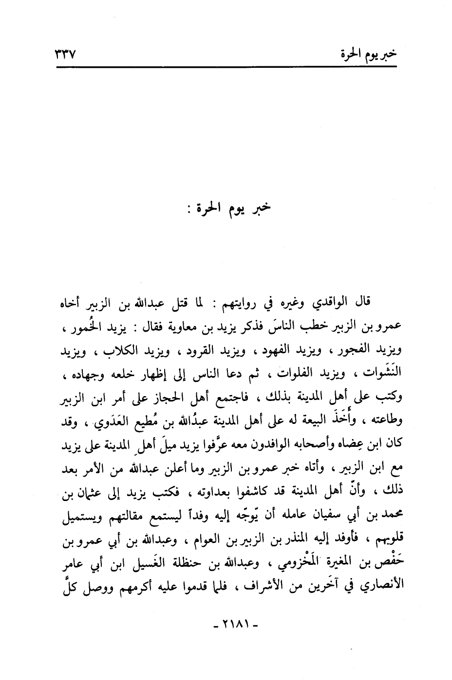 870- حَدَّثَنِي عباس بن هشام عن أبيه عن أبي مخنف قَالَ: خرج مسلم بْن عقبة المري بالناس إلى مَكَّة بعد الحرة وخلف على المدينة روح بْن زنباع الجذامي، فنزل به الموت يقفا المشلل، فَقَالَ لحصين بْن نمير: يا بردعة الحمار أما والله أن لو كان (هذا الأمر) «3» إلي ما وليتك هذا الجند «4» ، ولكن أمير المؤمنين أوصاني أن أوليك إياه، فأسرع وعم الأخبار وعجل الوقاع. وكان موت مسلم لسبع بقين من المحرم، فسار حصين فدخل مَكَّة فِي آخر المحرم سنة أربع وستين.