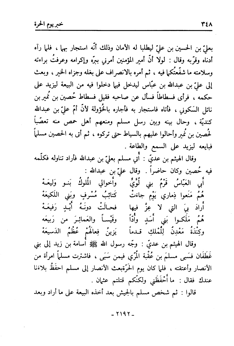 896- وقال الواقدي: لما جاء نعي يزيد أرسل الحصين إلى ابْن الزُّبَيْرِ والمسور وأصحابهما يسألهم فتح أبواب المسجد ليطوفوا بالبيت ثم ينصرفوا إلى الشام، فأبى ذلك ابْن الزُّبَيْرِ ثم أجابهم فطافوا وانصرفوا. وقال الحصين لابْن الزُّبَيْرِ «1» : صر معي الى الشام حتى أدعو لك، فقد مرج أمر الناس وما أجد أحق بالأمر منك، فَقَالَ ابْنُ الزُّبَيْرِ رافعًا صوته: أما دون أن أقتل بكل رجل من أهل الحرة عشرة من أهل الشام فلا، فَقَالَ حصين: يزعم هذا أنه داهية أكلمه سرًا ويكلمني علانية، وأدعوه إلى الخلافة ويتوعدني بالقتل، فسيعلم. ثم انصرف وأصحابه إلى الشام، فلما صار بالمدينة بلغه أن أهلها يريدون محاربته، فقام روح بْن زنباع على منبرها فَقَالَ: يا أهل المدينة ما هذا الذي بلغنا عنكم، فاعتذروا وكذبوا عَنْ أنفسهم، ومضى الحصين ومن معه إلى الشام.