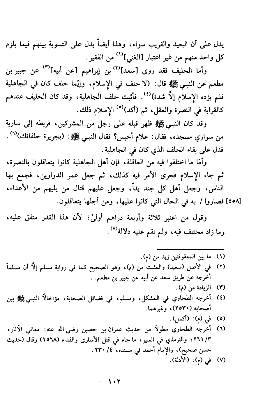 وَأما الحليف فقد روى سعد بن إِبْرَاهِيم عَن أَبِيه عَن جُبَير بن مطعم عَن النَّبِي صلى الله عَلَيْهِ وَسلم قَالَ لَا حلف فِي الْإِسْلَام وإيما حلف كَانَ فِي الْجَاهِلِيَّة فَلم يزده الْإِسْلَام إِلَّا شدَّة فَأثْبت حلف الْجَاهِلِيَّة وَقد كَانَ الحليف عِنْدهم كالقرابة فِي النُّصْرَة وَالْعقل ثمَّ أكد الْإِسْلَام ذَلِك