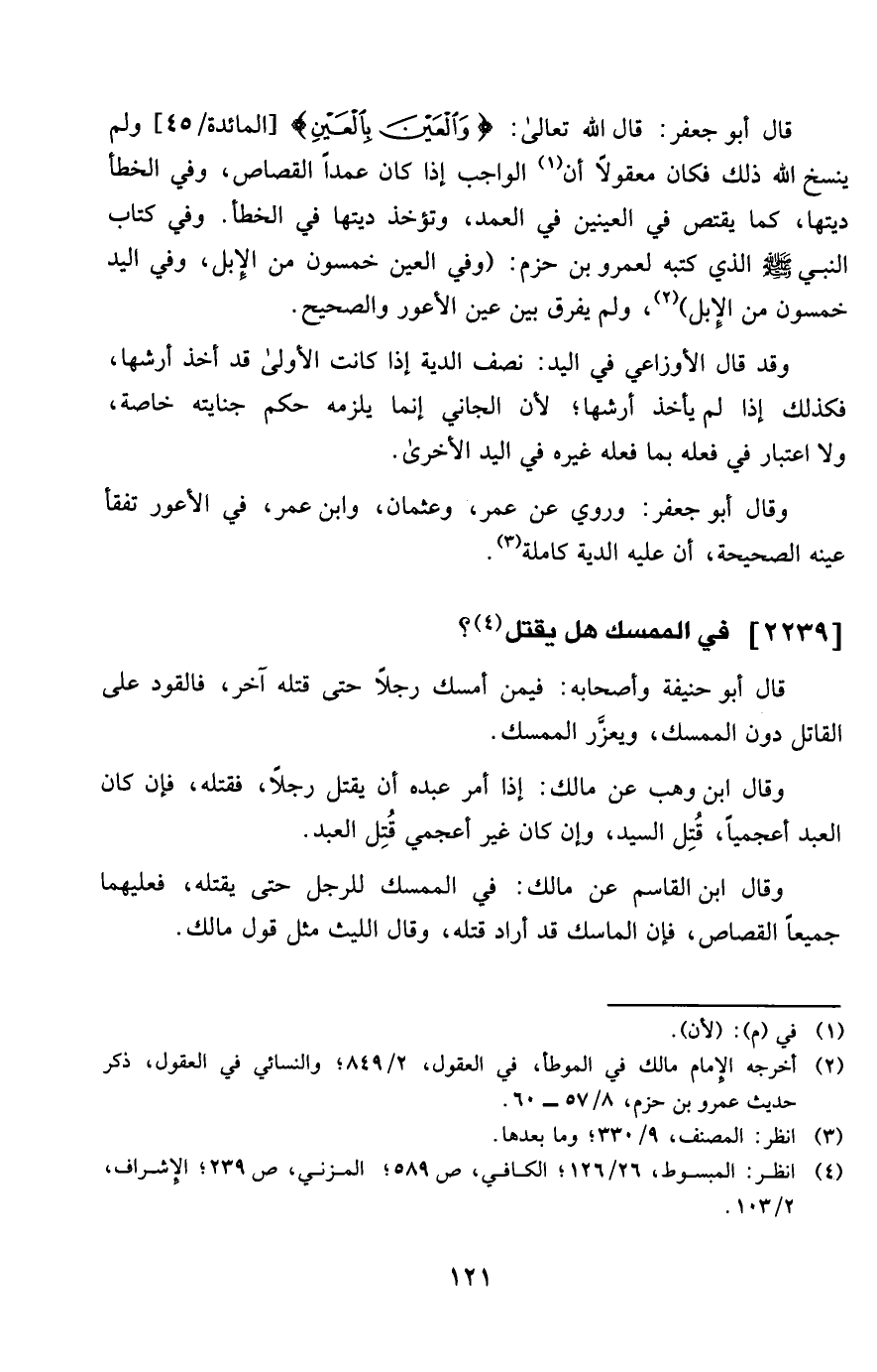 قَالَ أَبُو جَعْفَر قَالَ الله تَعَالَى {وَالْعين بِالْعينِ} الْمَائِدَة 45 وَلم ينْسَخ الله ذَلِك فَكَانَ معقولا أَن الْوَاجِب إِذا كَانَ عمدا الْقصاص وَفِي الْخَطَأ دِيَتهَا كَمَا يقْتَصّ فِي الْعَينَيْنِ فِي الْعمد وَتُؤْخَذ دِيَتهَا فِي الْخَطَأ وَفِي كتاب النَّبِي صلى الله عَلَيْهِ وَسلم الَّذِي كتبه لعَمْرو بن حزم وَفِي الْعين خَمْسُونَ من الْإِبِل وَفِي الْيَد خَمْسُونَ من الْإِبِل وَلم يفرق بَين عين الْأَعْوَر وَالصَّحِيح