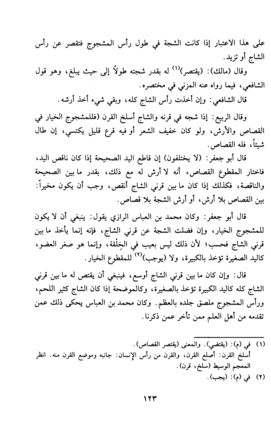 قَالَ أَبُو جَعْفَر وَكَانَ مُحَمَّد بن الْعَبَّاس الرَّازِيّ يَقُول يَنْبَغِي أَن لَا يكون للمشجوج الْخِيَار وَإِن فضلت الشَّجَّة عَن قَرْني الشاج فَإِنَّهُ إِنَّمَا يَأْخُذ مَا بَين قَرْني الشاج فَحسب لِأَن ذَلِك لَيْسَ بِعَيْب فِي الْخلقَة وَإِنَّمَا هُوَ صغر الْعُضْو كَالْيَدِ الصَّغِيرَة تُؤْخَذ بالكبيرة وَلَا يُوجب للمقطوع الْخِيَار