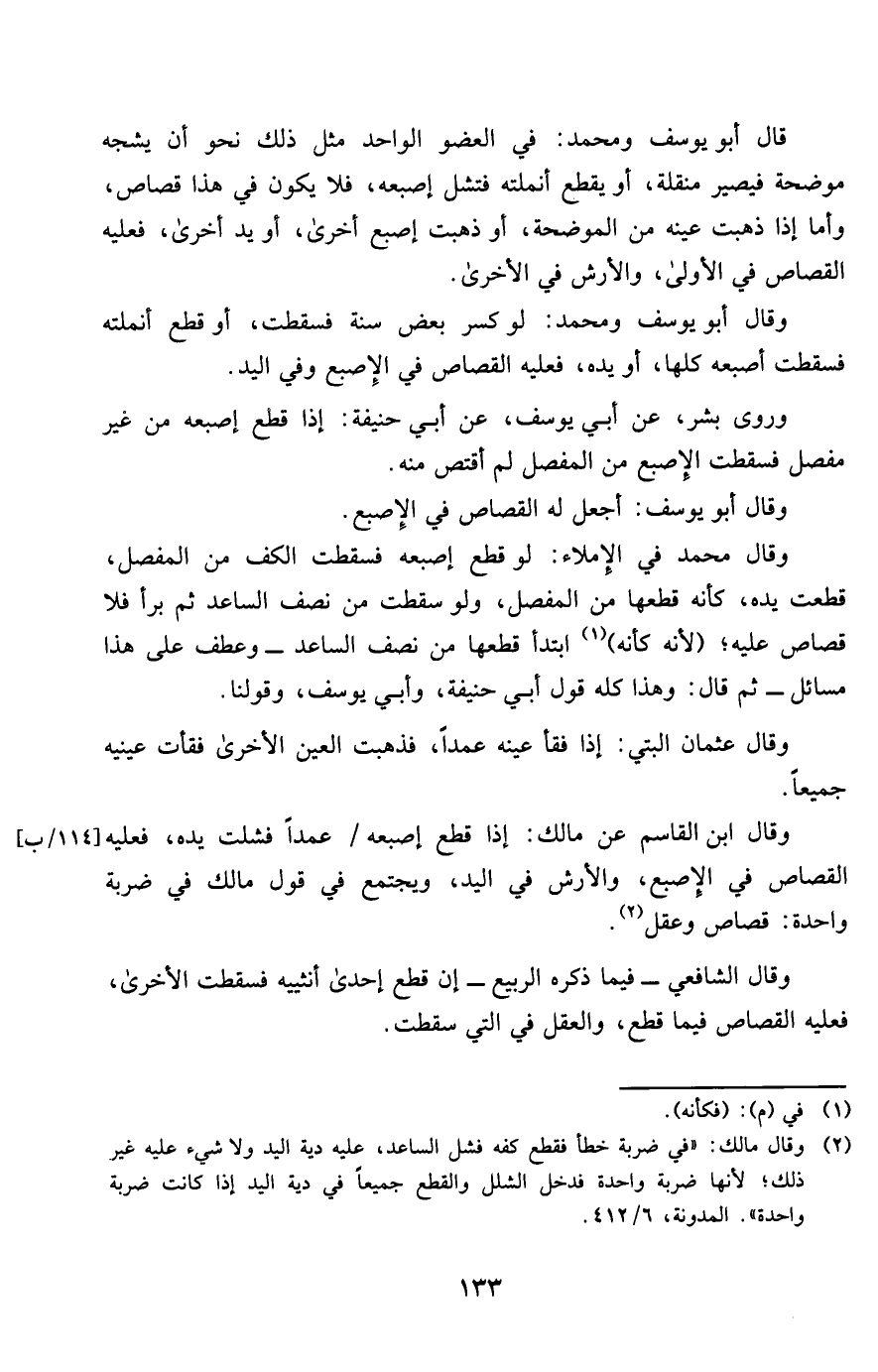 قَالَ أَبُو يُوسُف وَمُحَمّد فِي الْعُضْو الْوَاحِد مثل ذَلِك نَحْو أَن يشجه مُوضحَة فَيصير منقلة أَو يقطع أنملته فتشل إصبعه فَلَا يكون فِي هَذَا قصاص وَأما إِذا ذهبت عينه من الْمُوَضّحَة أَو ذهبت إِصْبَع أُخْرَى أَو يَد أُخْرَى فَعَلَيهِ الْقصاص فِي الأولى وَالْأَرْش فِي الْأُخْرَى
