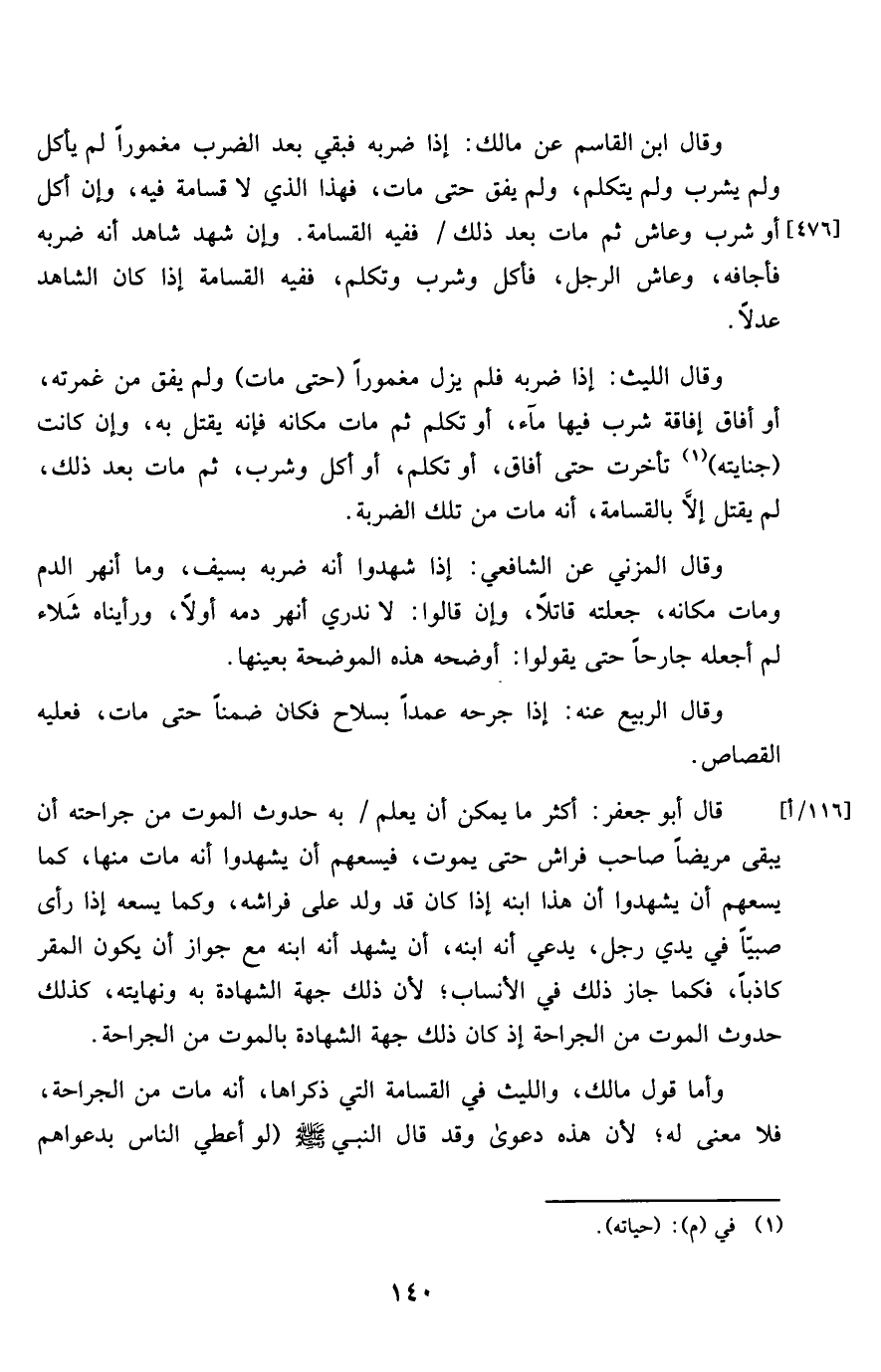 وَقَالَ اللَّيْث إِذا ضربه فَلم يزل مغمورا حَتَّى مَاتَ وَلم يفق من غمرته أَو أَفَاق إفاقة شرب فِيهَا مآء أَو تكلم ثمَّ مَاتَ مَكَانَهُ فَإِنَّهُ يقتل بِهِ وَإِن كَانَت جِنَايَته تَأَخَّرت حَتَّى أَفَاق أَو تكلم أَو أكل وَشرب ثمَّ مَاتَ بعد ذَلِك لم يقتل إِلَّا بالقسامة أَنه مَاتَ من تِلْكَ الضَّرْبَة