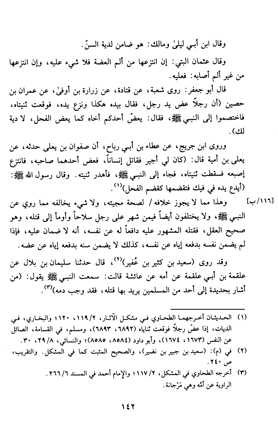 قَالَ أَبُو جَعْفَر روى شُعْبَة عَن قَتَادَة عَن زُرَارَة بن أوفى عَن عمرَان بن حُصَيْن أَن رجلا عض يَد رجل فَقَالَ بِيَدِهِ هَكَذَا وَنزع يَده فَوَقَعت ثنيتاه فاختصموا إِلَى النَّبِي صلى الله عَلَيْهِ وَسلم فَقَالَ يعَض أحدكُم أَخَاهُ كَمَا يعَض الْفَحْل لَا دِيَة لَك