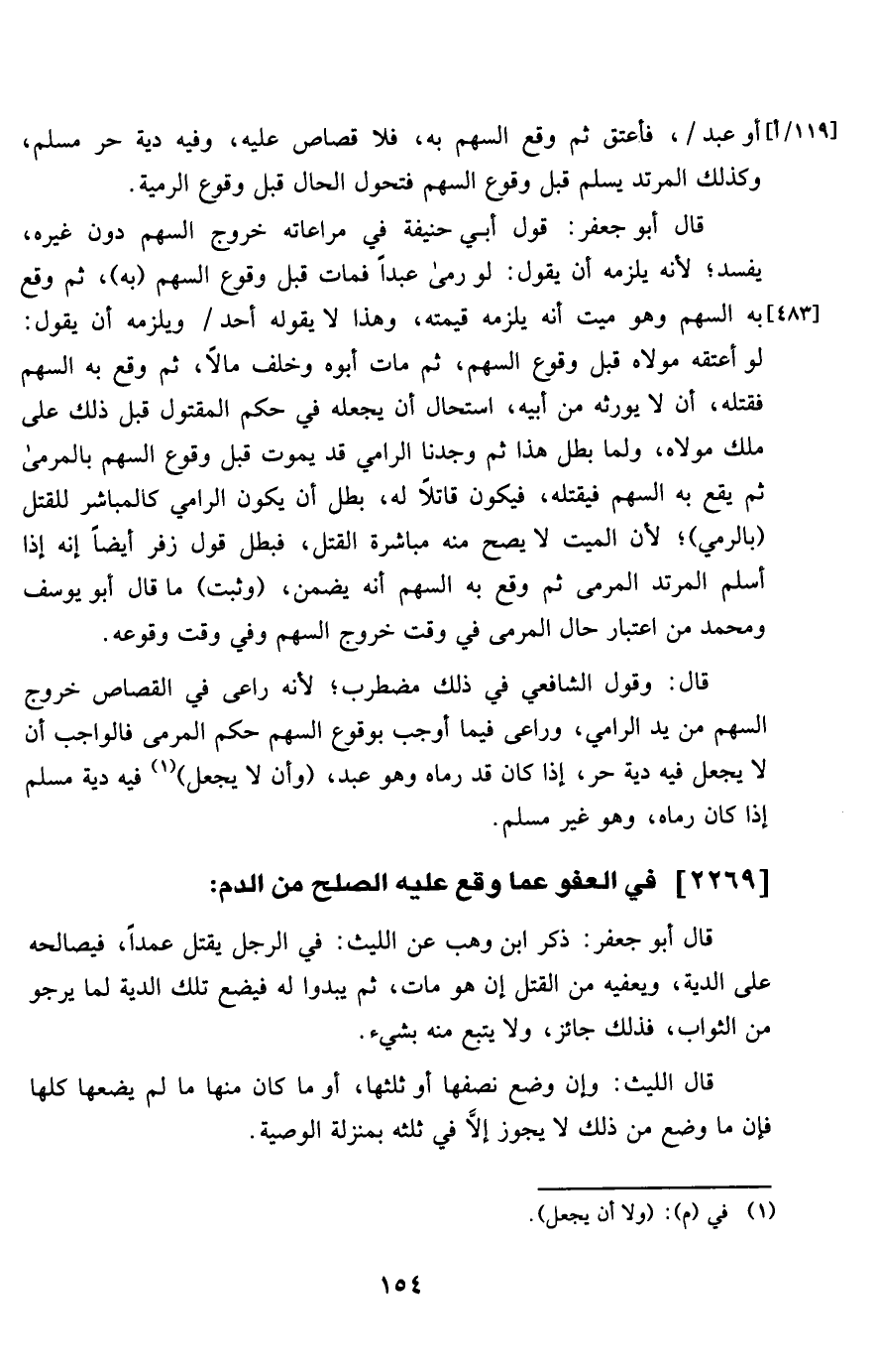 قَالَ أَبُو جَعْفَر قَول أبي حنيفَة فِي مراعاته خُرُوج السهْم دون غَيره يفْسد لِأَنَّهُ يلْزمه أَن يَقُول لَو رمى عبدا فَمَاتَ قبل وُقُوع السهْم بِهِ ثمَّ وَقع بِهِ السهْم وَهُوَ ميت أَنه يلْزمه قِيمَته وَهَذَا لَا يَقُوله أحد وَيلْزمهُ أَن يَقُول لَو أعْتقهُ مَوْلَاهُ قبل وُقُوع السهْم ثمَّ مَاتَ أَبوهُ وَخلف مَالا ثمَّ وَقع بِهِ السهْم فَقتله أَن لَا يورثه من أَبِيه اسْتَحَالَ أَن يَجعله فِي حكم الْمَقْتُول قبل ذَلِك على ملك مَوْلَاهُ وَلما بَطل هَذَا ثمَّ وجدنَا الرَّامِي قد يَمُوت قبل وُقُوع السهْم بالمرمى ثمَّ يَقع بِهِ السهْم فيقتله فَيكون قَاتلا لَهُ بَطل أَن يكون الرَّامِي كالمباشر للْقَتْل بِالرَّمْي لِأَن الْمَيِّت لَا يَصح مِنْهُ مُبَاشرَة الْقَتْل فَبَطل قَول زفر أَيْضا إِنَّه إِذا أسلم الْمُرْتَد المرمى ثمَّ وَقع بِهِ السهْم أَنه يضمن وَثَبت مَا قَالَ أَبُو يُوسُف وَمُحَمّد من اعْتِبَار حَال المرمى فِي وَقت خُرُوج السهْم وَفِي وَقت وُقُوعه