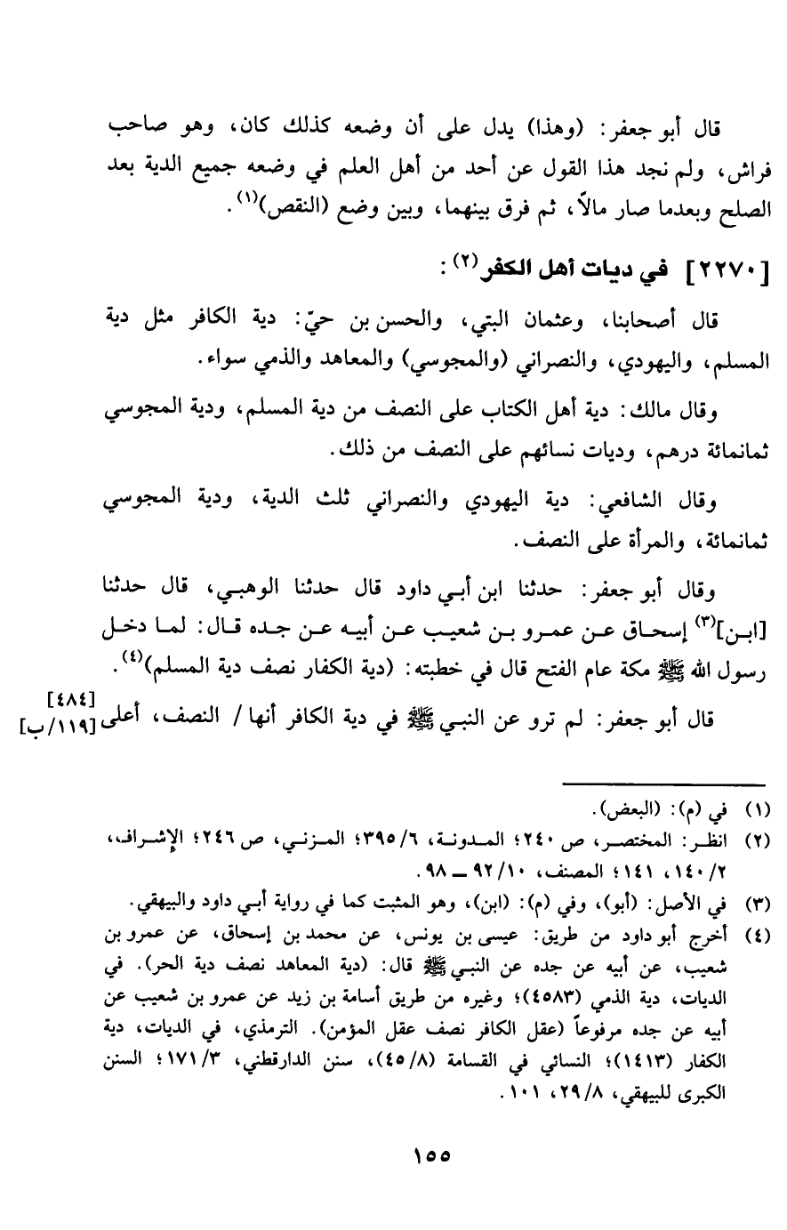 وَقَالَ أَبُو جَعْفَر حَدثنَا ابْن أبي دَاوُد قَالَ حَدثنَا الْوَهْبِي قَالَ حَدثنَا ابْن إِسْحَاق عَن عَمْرو بن شُعَيْب عَن أَبِيه عَن جده قَالَ لما دخل رَسُول الله صلى الله عَلَيْهِ وَسلم مَكَّة عَام الْفَتْح قَالَ فِي خطبَته دِيَة الْكفَّار نصف دِيَة الْمُسلم