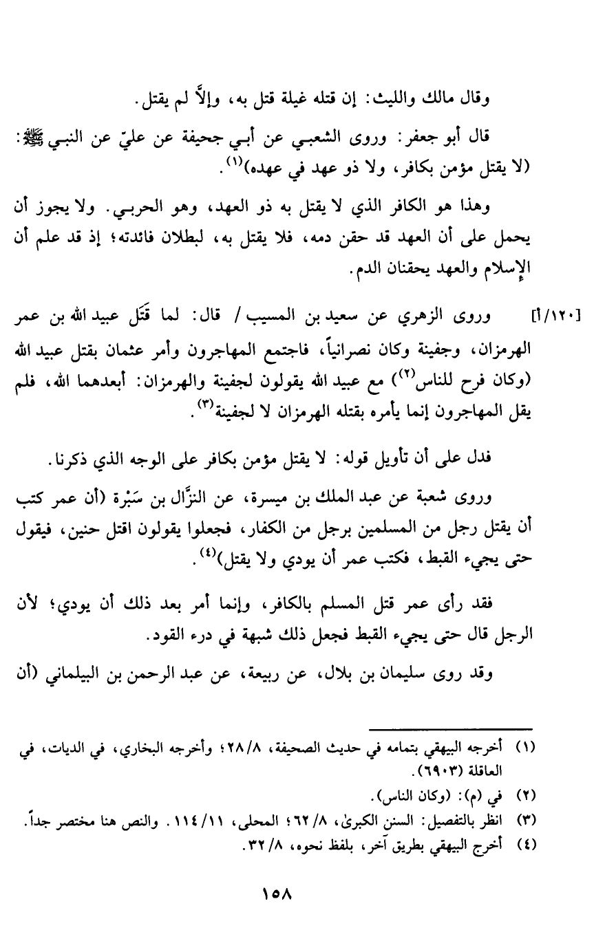 قَالَ أَبُو جَعْفَر وروى الشّعبِيّ عَن أبي جُحَيْفَة عَن عَليّ عَن النَّبِي صلى الله عَلَيْهِ وَسلم لَا يقتل مُؤمن بِكَافِر وَلَا ذُو عهد فِي عَهده