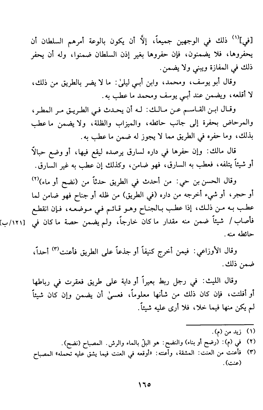 وَقَالَ أَبُو يُوسُف وَمُحَمّد وَابْن أبي ليلى مَا لَا يضر بِالطَّرِيقِ من ذَلِك لَا أقلعه وَيضمن عِنْد أبي يُوسُف وَمُحَمّد مَا عطب بِهِ
