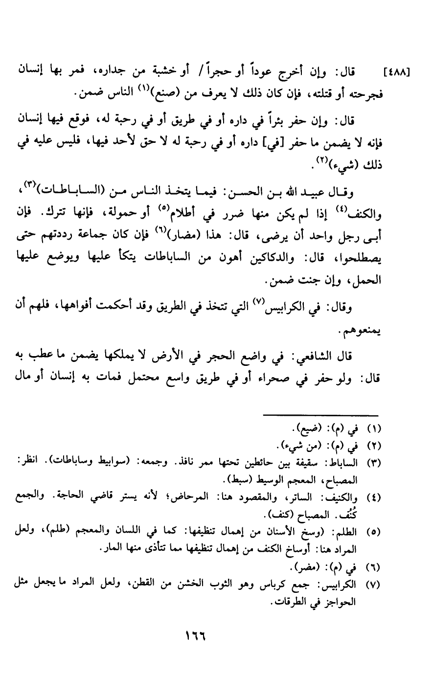 وَقَالَ عبيد الله بن الْحسن فِيمَا يتَّخذ النَّاس من الساباطات والكنف إِذا لم يكن مِنْهَا ضَرَر فِي أطلام أَو حمولة فَإِنَّهَا تتْرك فَإِن أَبى رجل وَاحِد أَن يرضى قَالَ هَذَا مضار فَإِن كَانَ جماع رددتهم حَتَّى يصطلحوا قَالَ والدكاكين أَهْون من الساباطات يتكأ عَلَيْهَا وَيُوضَع عَلَيْهَا الْحمل وَإِن جنت ضمن