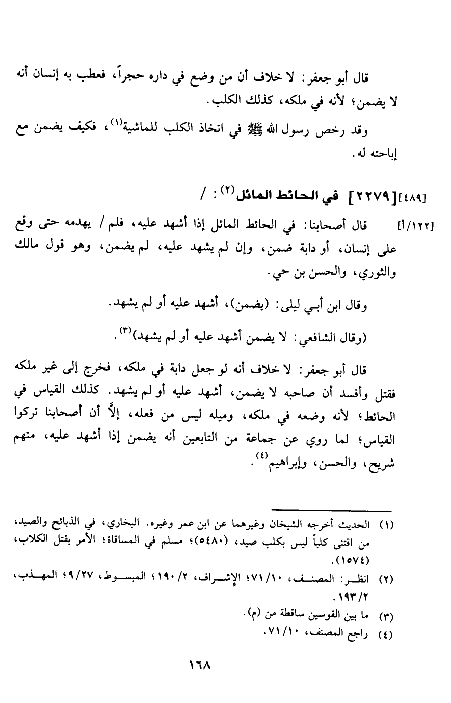 قَالَ أَبُو جَعْفَر لَا خلاف أَنه لَو جعل دَابَّة فِي ملكه فَخرج إِلَى غير ملكه فَقتل وأفسد أَن صَاحبه لَا يضمن أشهد عَلَيْهِ أَو لم يشْهد كَذَلِك الْقيَاس فِي الْحَائِط لِأَنَّهُ وَضعه فِي ملكه وميله لَيْسَ من فعله إِلَّا أَن أَصْحَابنَا تركُوا الْقيَاس لما رُوِيَ عَن جمَاعَة من التَّابِعين أَنه يضمن إِذا أشهد عَلَيْهِ مِنْهُم شُرَيْح وَالْحسن وَإِبْرَاهِيم