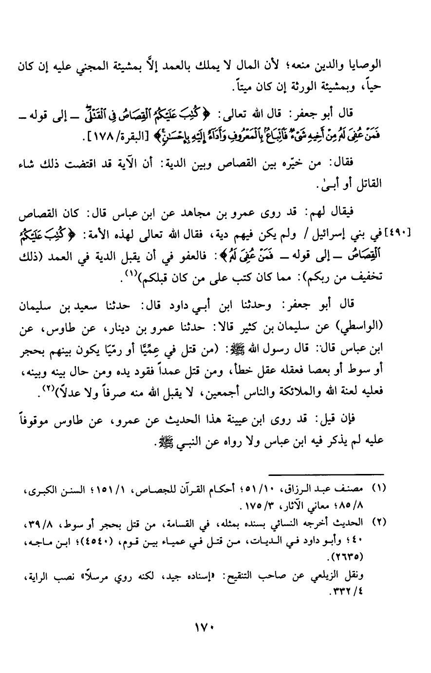 قَالَ أَبُو جَعْفَر قَالَ الله تَعَالَى {كتب عَلَيْكُم الْقصاص فِي الْقَتْلَى} إِلَى قَوْله {فَمن عُفيَ لَهُ من أَخِيه شَيْء فاتباع بِالْمَعْرُوفِ وَأَدَاء إِلَيْهِ بِإِحْسَان} الْبَقَرَة 178
