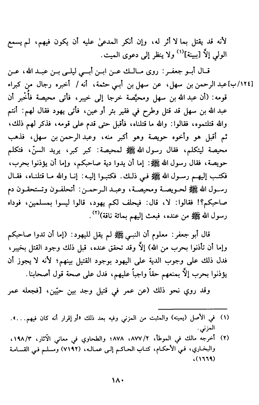 قَالَ أَبُو جَعْفَر روى مَالك عَن ابْن أبي ليلى بن عبد الله عَن عبد الرَّحْمَن بن سهل عَن سهل بن أبي حثْمَة أَنه أخبرهُ رجال من كبراء قومه أَن عبد الله بن سهل ومحيصة خرجا إِلَى خَبِير فَأتى محيصة فَأخْبر أَن عبد الله بن سهل قد قتل وَطرح فِي فَقير بِئْر أَو عين فَأتى يهود فَقَالَ لَهُم أَنْتُم وَالله قَتَلْتُمُوهُ فَقَالَ وَالله مَا قَتَلْنَاهُ فَأقبل حَتَّى قدم على قومه فَذكر لَهُم ذَلِك ثمَّ أقبل هُوَ وَأَخُوهُ حويصة وَهُوَ أكبر مِنْهُ وَعبد الرَّحْمَن بن سهل فَذهب محيصة ليَتَكَلَّم فَقَالَ رَسُول الله صلى الله عَلَيْهِ وَسلم لمحيصة كبر كبر يُرِيد السن فَتكلم حويصة فَقَالَ رَسُول الله صلى الله عَلَيْهِ وَسلم إِمَّا أَن يدوا دِيَة صَاحبكُم وَإِمَّا أَن يؤذنوا بِحَرب فَكتب إِلَيْهِم رَسُول الله صلى الله عَلَيْهِ وَسلم فِي ذَلِك فَكَتَبُوا إِلَيْهِ إِنَّا وَالله مَا قَتَلْنَاهُ فَقَالَ رَسُول الله صلى الله عَلَيْهِ وَسلم لحويصة ومحيصة وَعبد الرَّحْمَن أتحلفون وتستحقون دم صَاحبكُم فَقَالُوا لَا قَالَ فَيحلف لكم يهود قَالُوا لَيْسُوا بمسلمين فوداه رَسُول الله صلى الله عَلَيْهِ وَسلم من عِنْده فَبعث إِلَيْهِم بِمِائَة نَاقَة